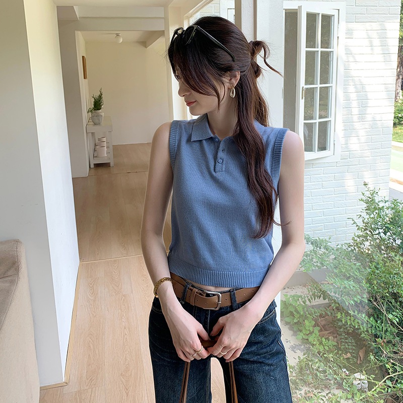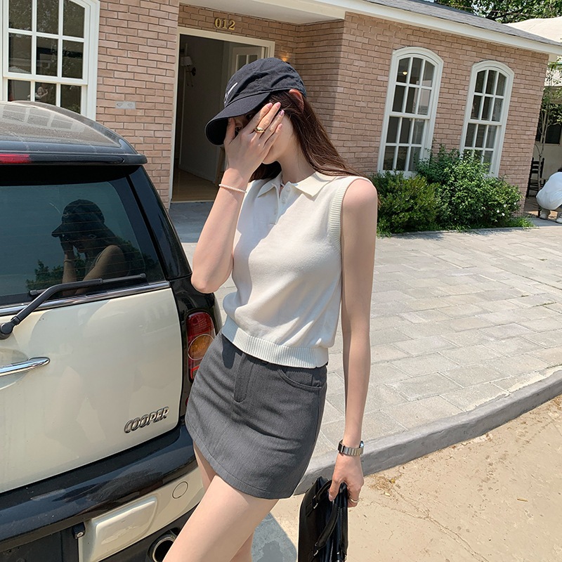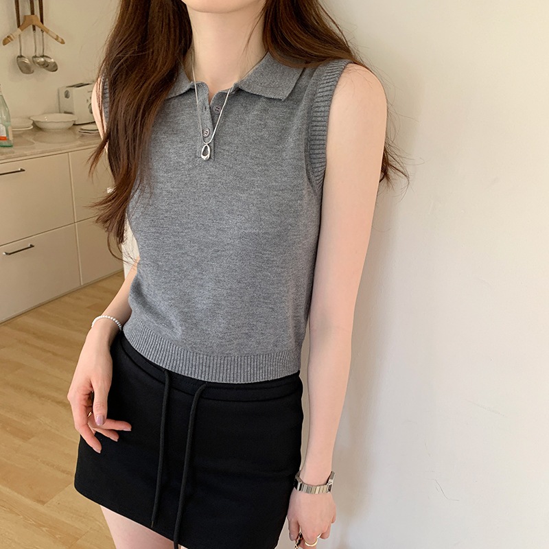 3色韓国衆灰色polo襟袖なしウールニット女性夏新型独特なシングルは上着を着ます