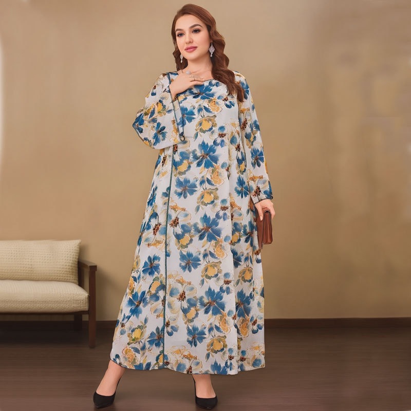 中東気質優雅なプリントワンピース女性丸首長袖ゆったりしている長いタイプ通勤気質カジュアルなスカート