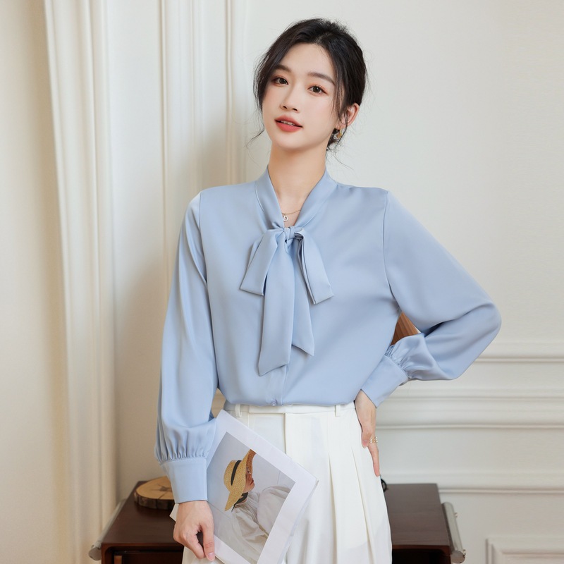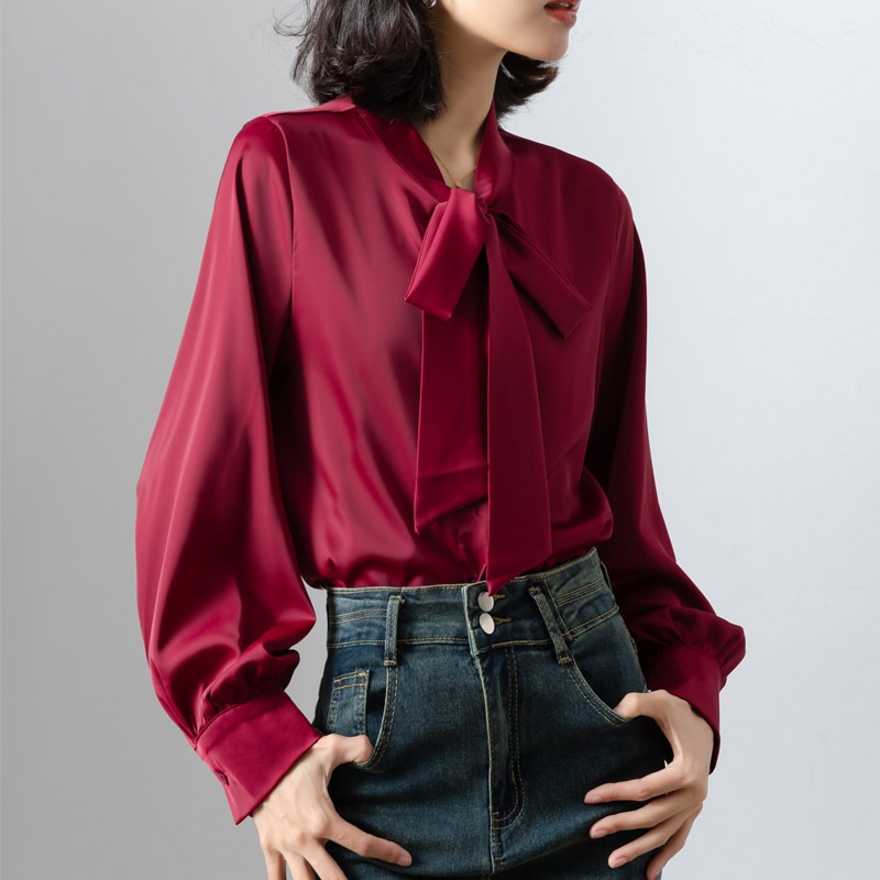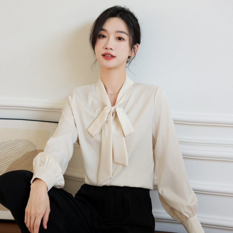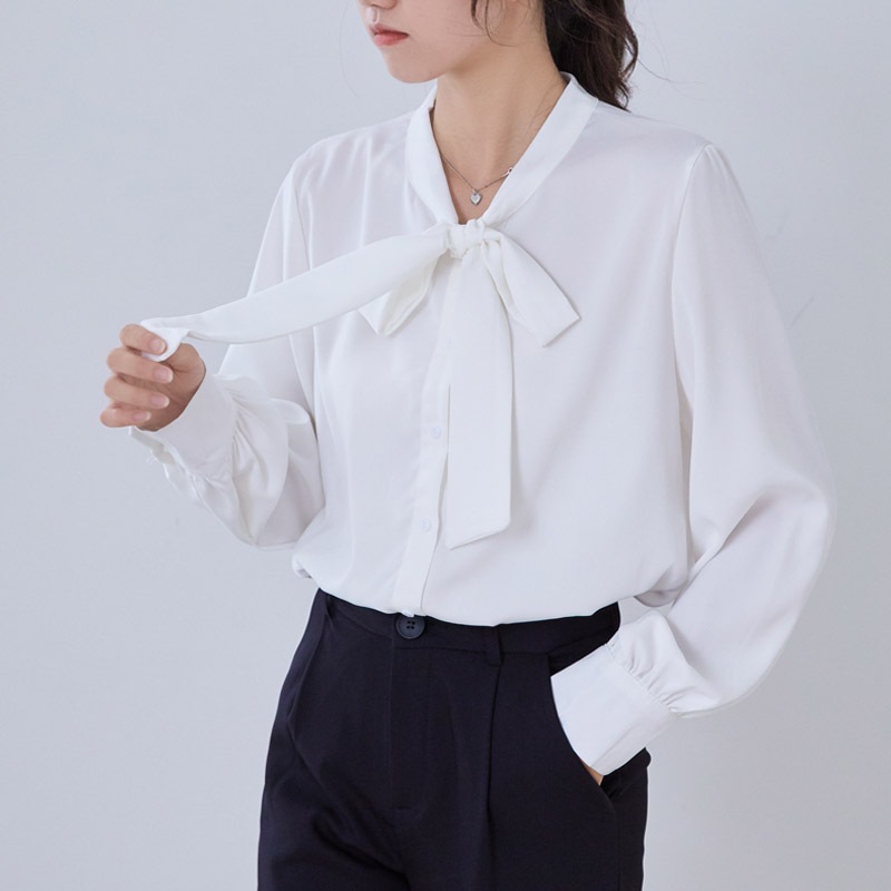 5色4ヤード春新しいサテン黒いシャツ長袖通勤職業シャツ蝶結びリボン
