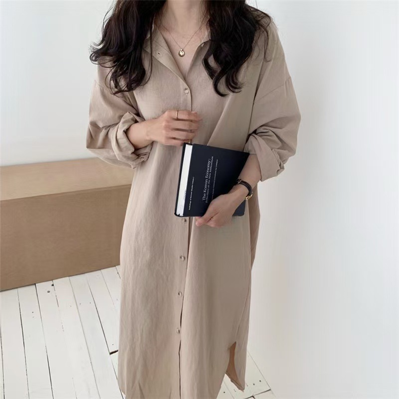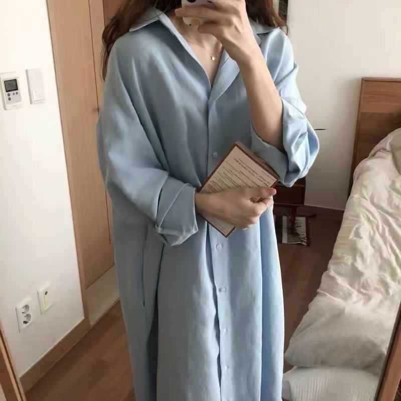 4色5ヤードpol襟単列多ボタンパンツ長シャツワンピース綿麻シャツワンピース長袖