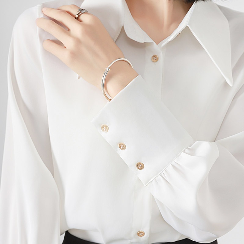 サテン白い長袖シャツ女性春秋新デザイン感小尖襟通勤職業上着シャツ女性