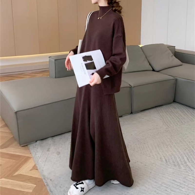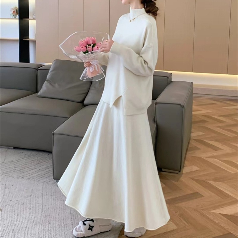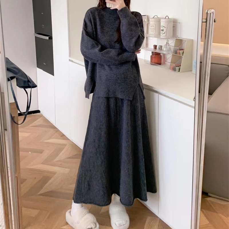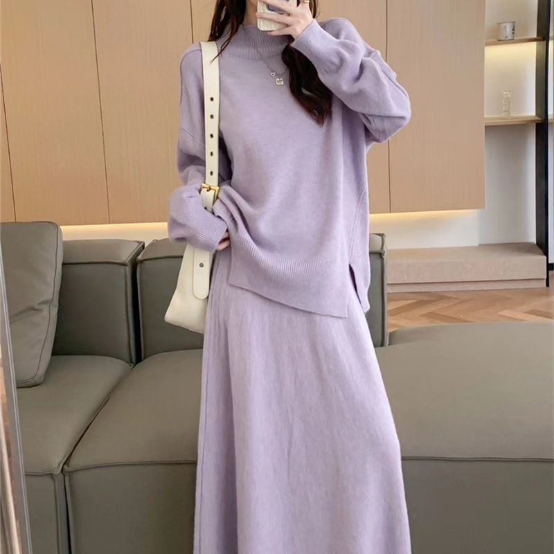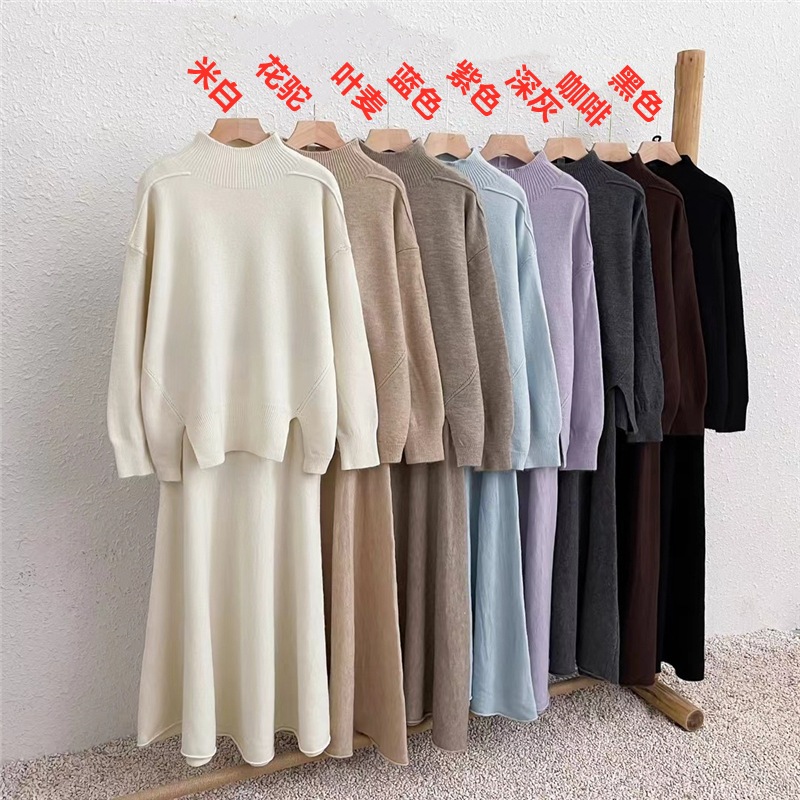 8色秋冬気質半高襟セーターセットニットカジュアルロングスカート2枚