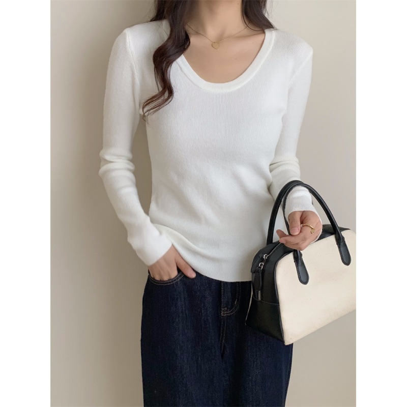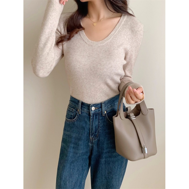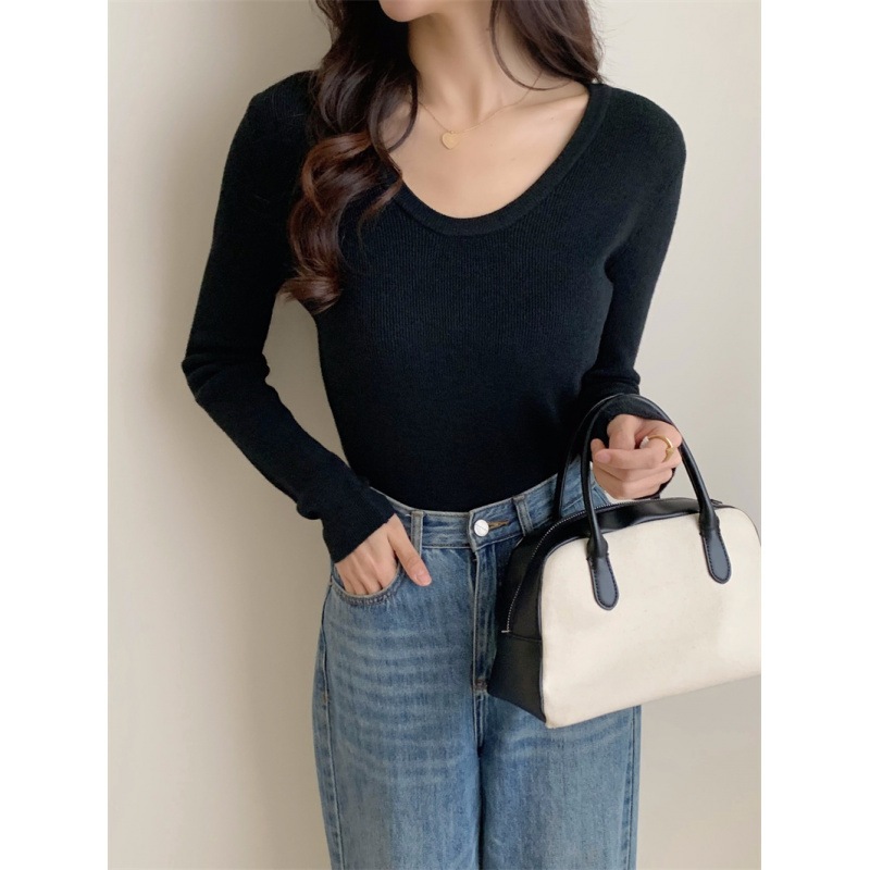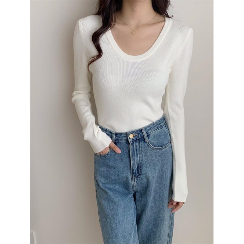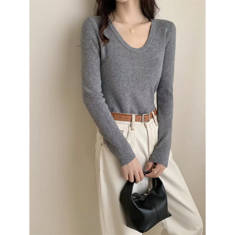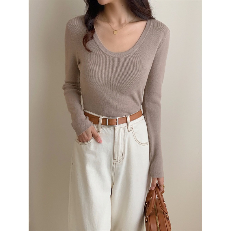 6色秋冬韓国深u襟平織り純色気質百合カジュアルシンプルニット