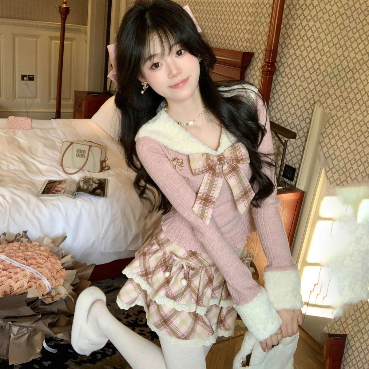 【3日出荷】格子模様 学院 リボン 長袖 上着 ポンポンスカート セット 春服 レディース