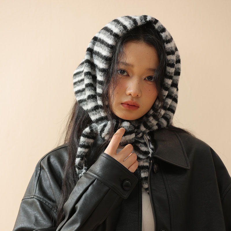 【3日出荷】ストライプカシミヤ三角マフラー 秋冬 ヘアバンド兼防寒 バブーシュカ