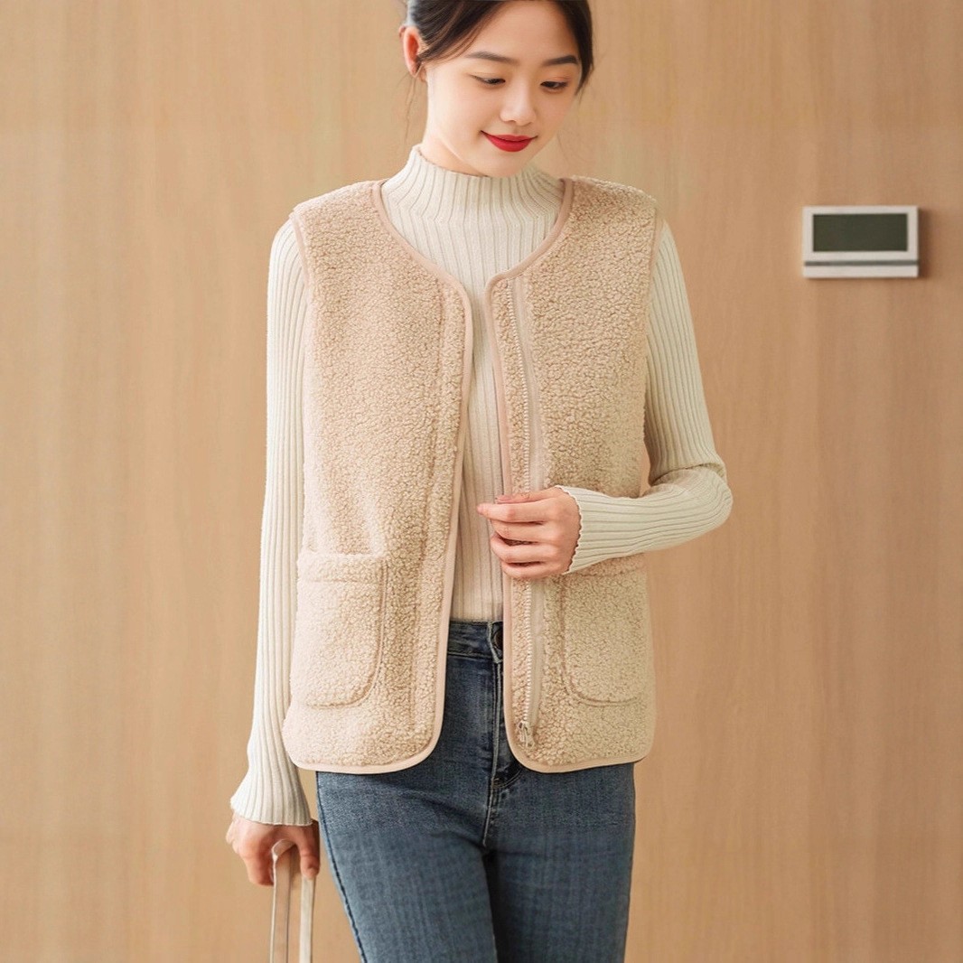 10個セット レディースラムウールベスト2026秋冬アウター防寒スリムカーディガン韓国風ファッションコート一体型ファー