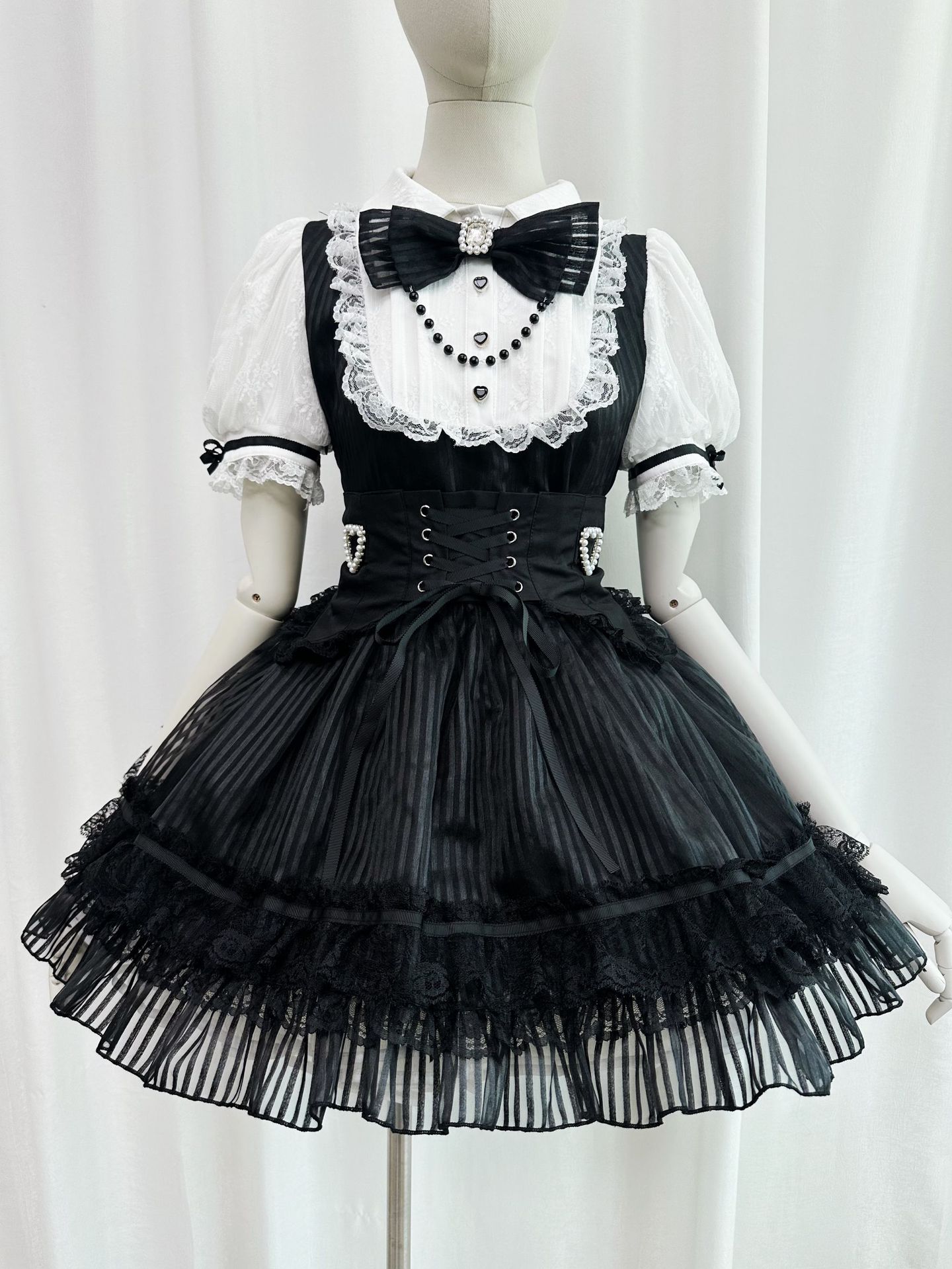 10個セット ロリータストライプレースリボンワンピースパフスリーブウエストマークフレアスカート 舞台衣装