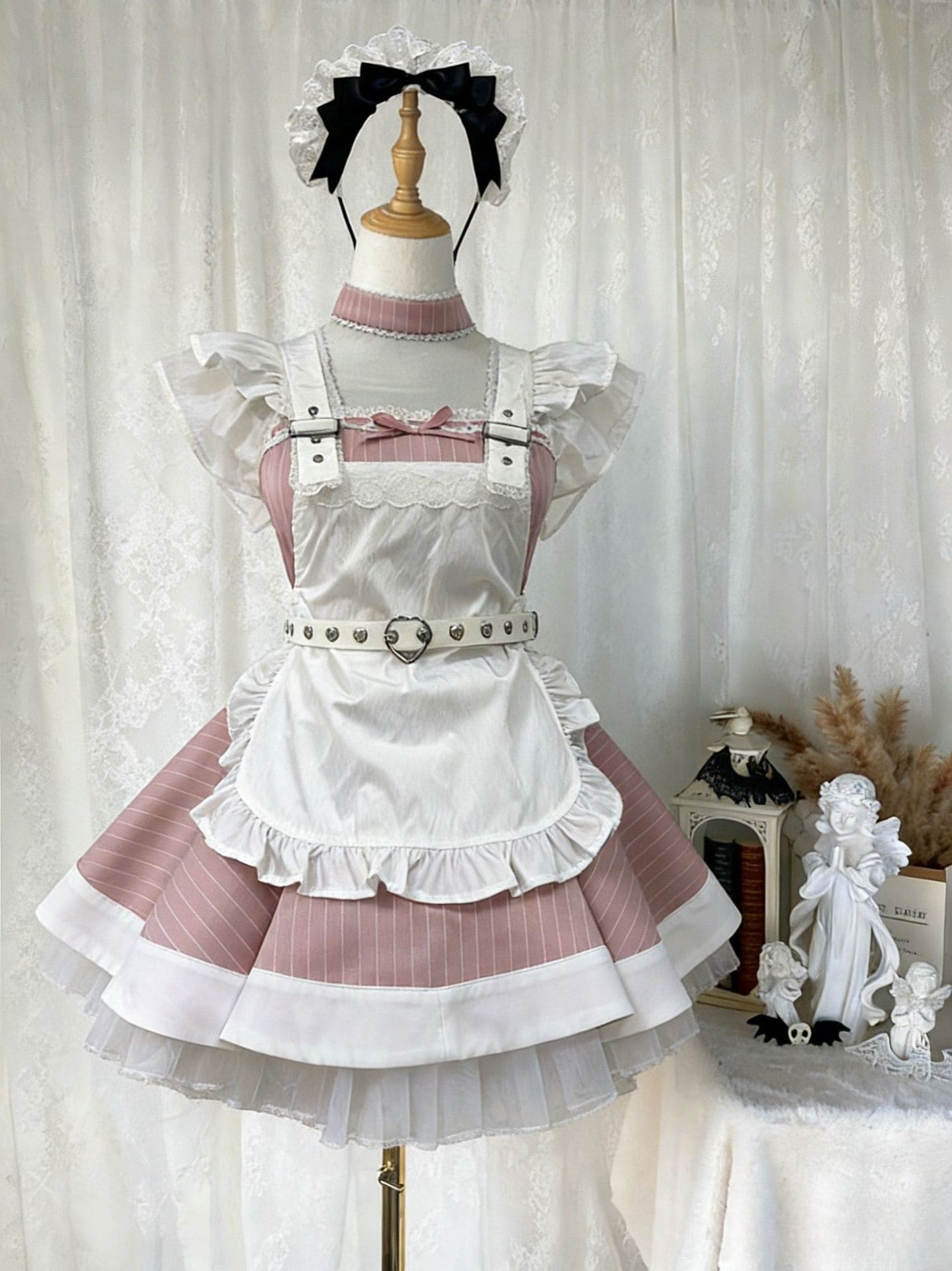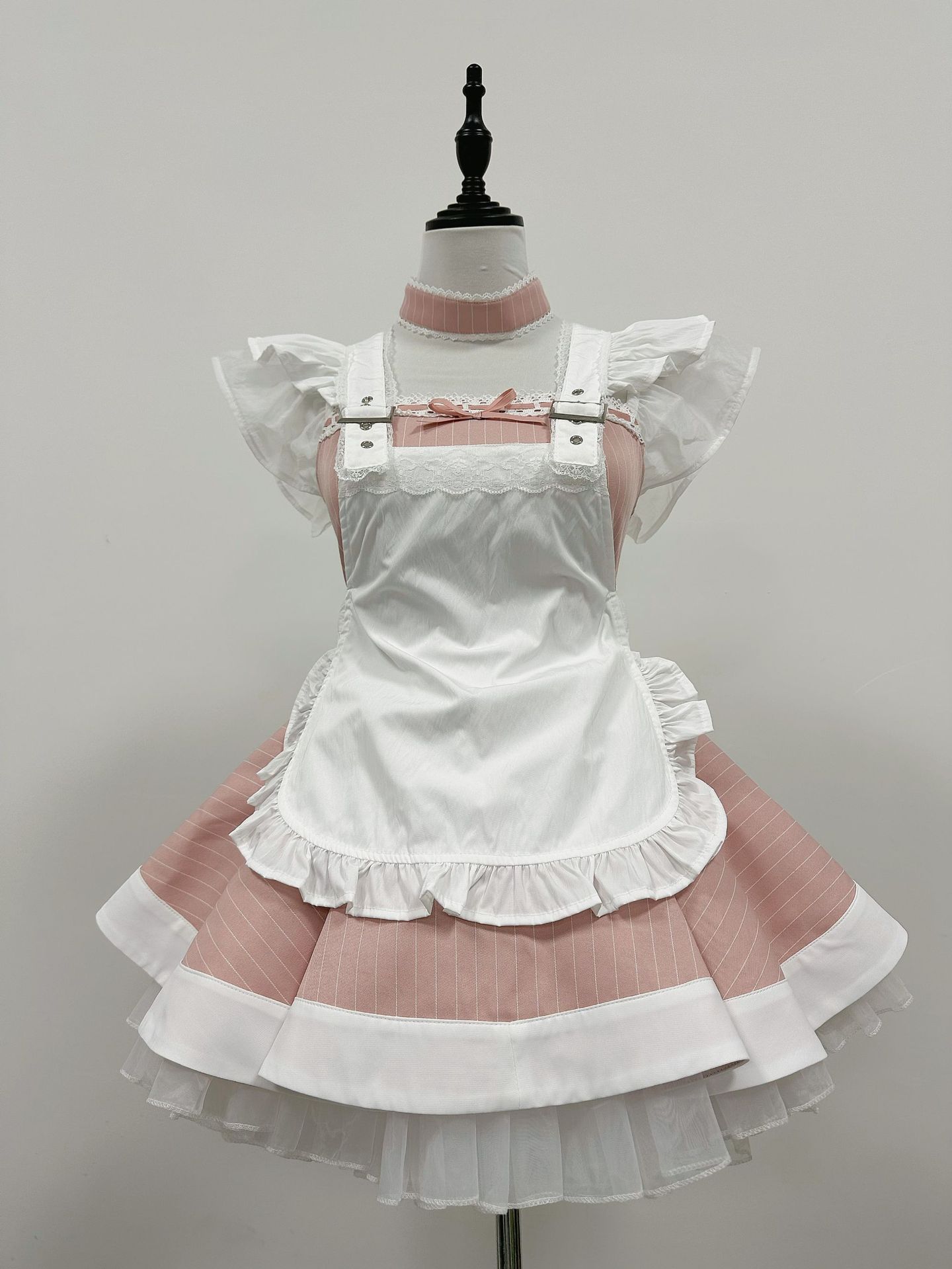 メイド服ピンク白ストライプロリータ犬柄ショートワンピース 可愛いメイドセット 舞台衣装