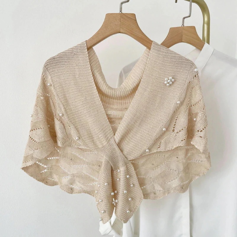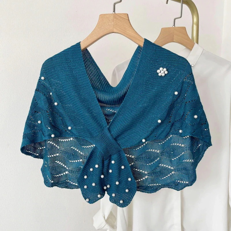 ニットショール女性用アウター 春夏用首元保護ニット エアコン対策 ウェーブパール付きショール 偽襟付きショール