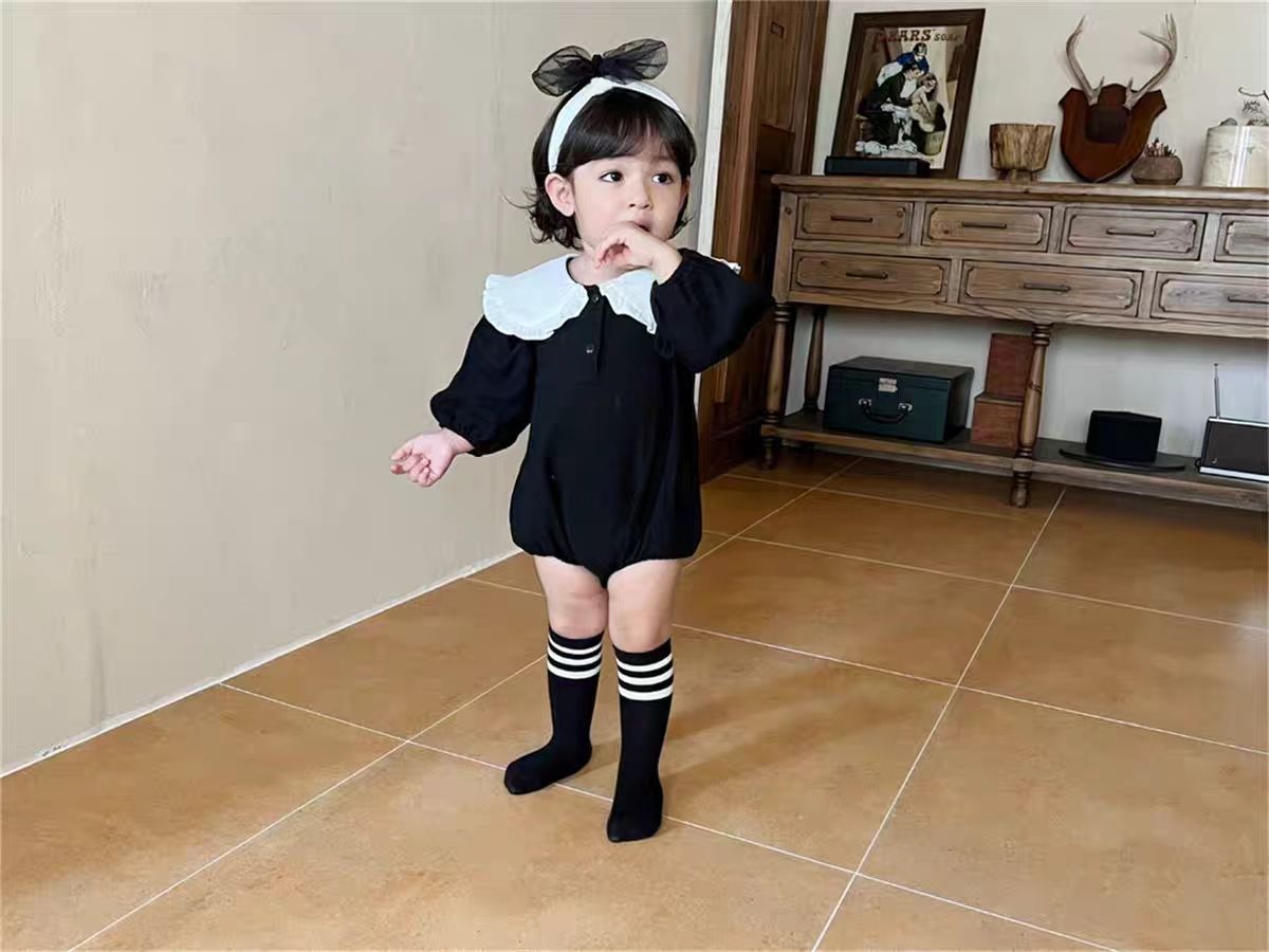 韓国版黒カラーの開襟人形女性の赤ちゃんの長袖三角ハーベストとの純色チェックロンパースロンパース ロンパース 女の子ロンパース 長袖 ベビー服ロンパース