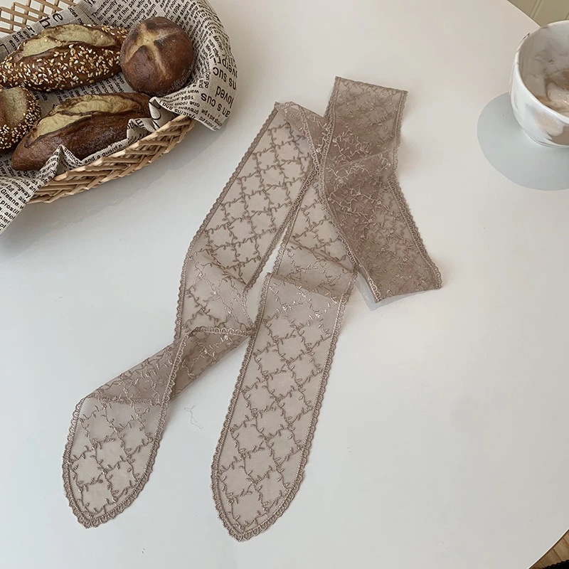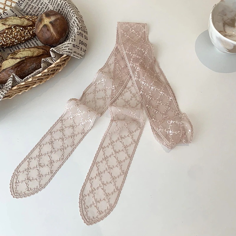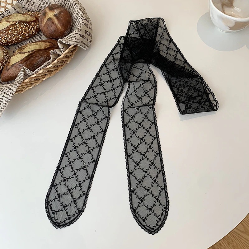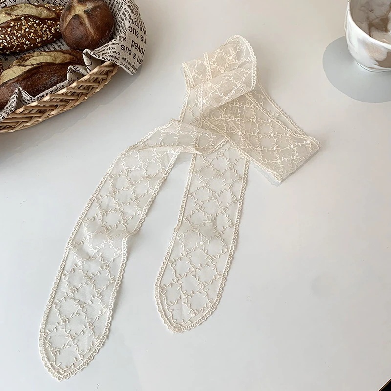 レーススカーフ女性用ヘアバンド韓国風ナチュラル系 万能リボン付きins流行ヘッドスカーフ透かし花装飾シースカーフマフラー
