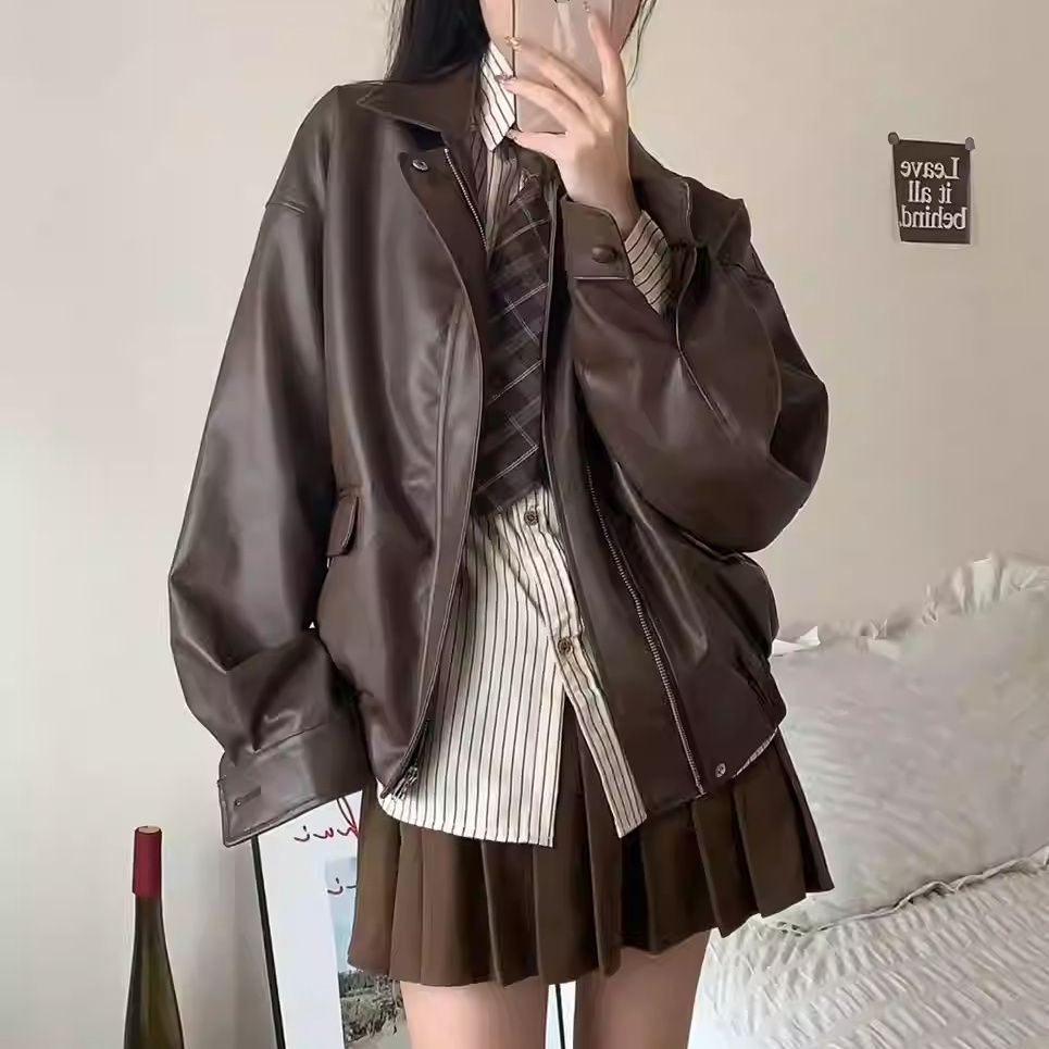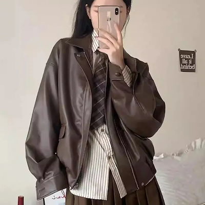 ファッションブラウンのレザージャケットとのレトロな摩耗バイカージャケットジャケットトップス