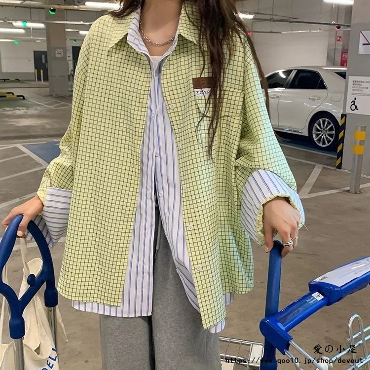 チェックシャツとの新作コートレディースデザインセンスフェイク2枚スリム長袖ファッションブランドシックなトップス
