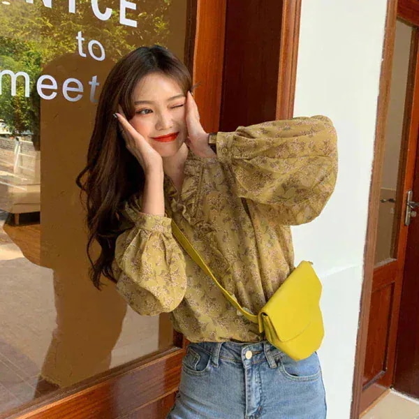 2026年新作 ブラウス 韓国風 柔らかな花柄シフォンブラウス 長袖 ベースレイヤー バルーンスリーブ トップス シャツ・シフォンブラウス
