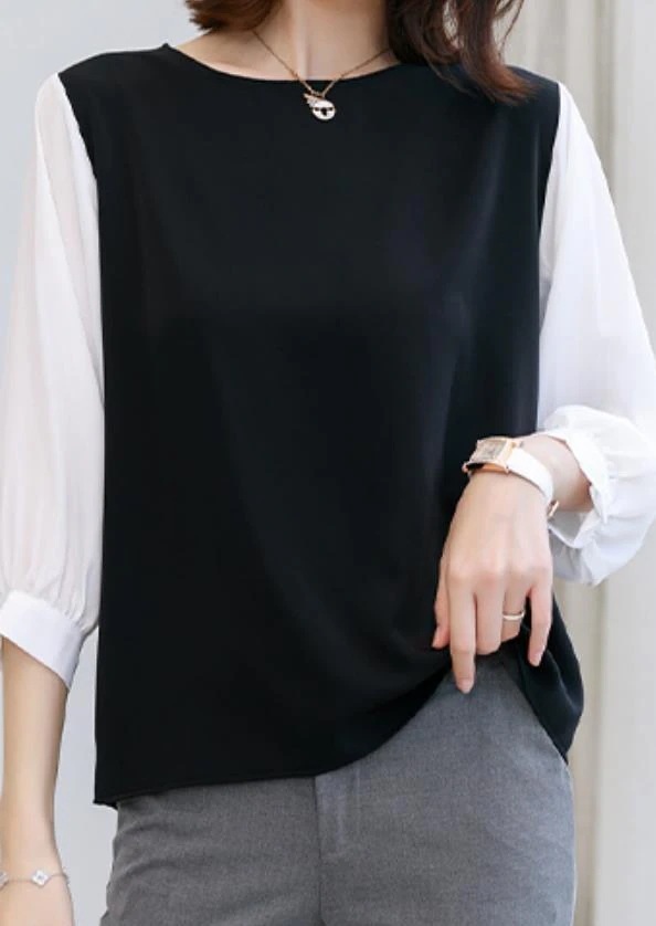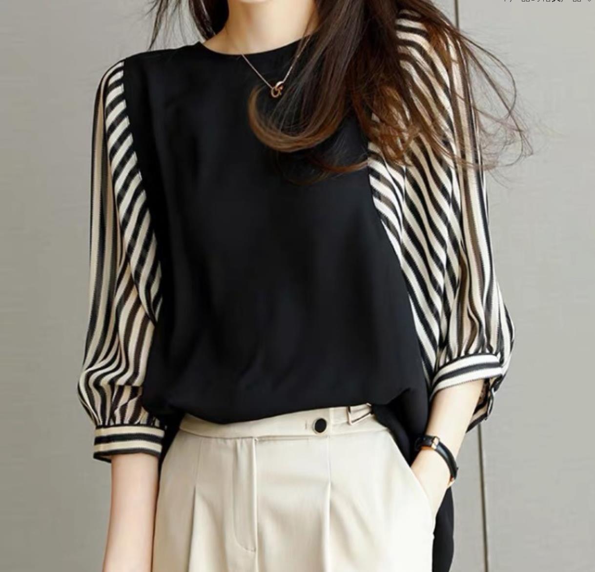 2026年夏 日本・韓国風シャツ 婦人用 夏用 カラーブロック 丸首トップス ゆったり ショートスリーブ コットン シャツ・シフォンシャツ