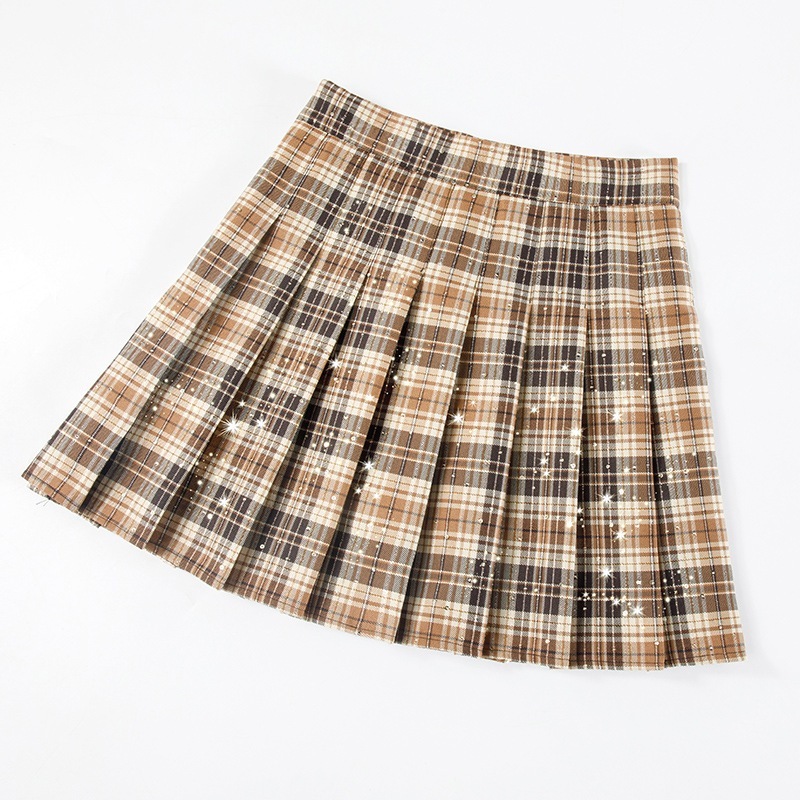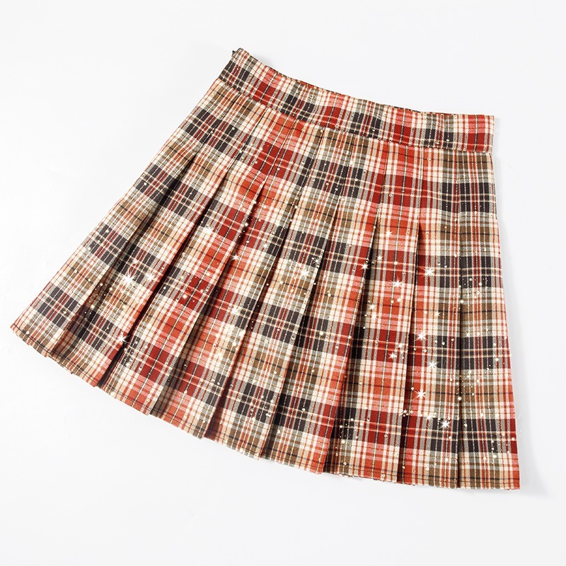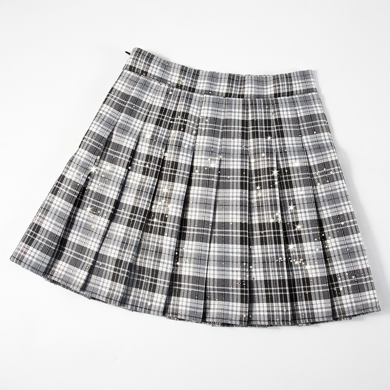 レディースチェック柄プリーツスカートスパンコールハイウエストショートスカート2026Aラインスカートスリミングミディスカート