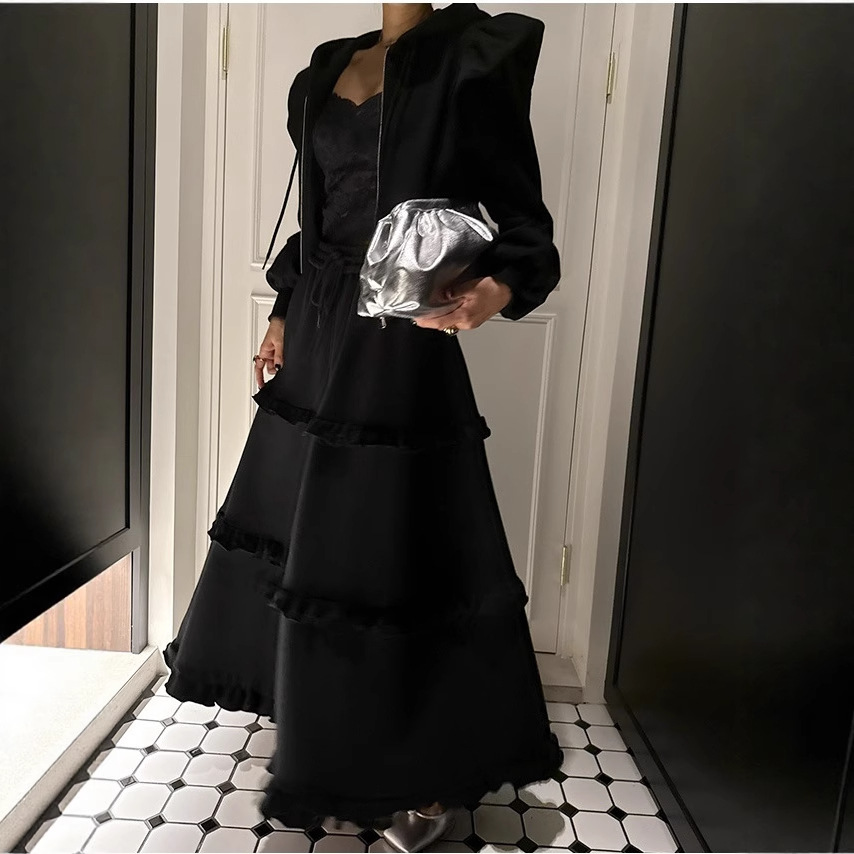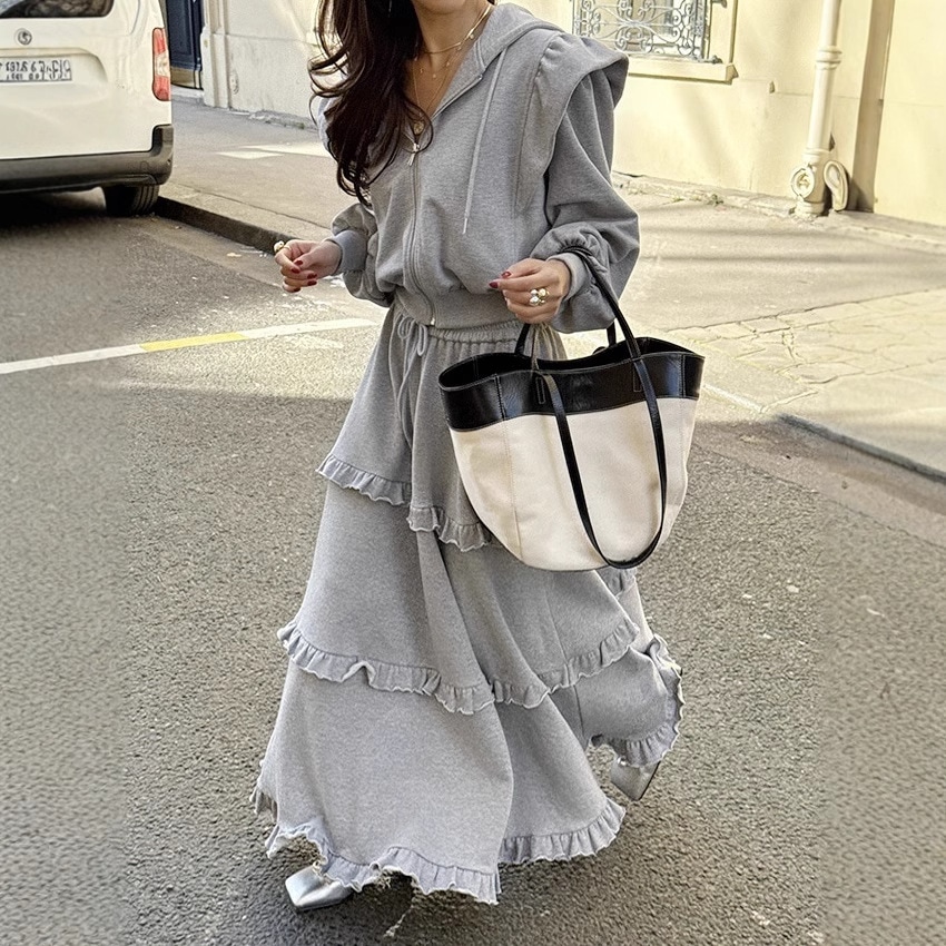 秋冬まで穿ける!セットアップ レディース スカート 上下セット パーカー フード付き カジュアル 春秋 ロングスカート フリル ジップアップパーカー おしゃれ きれいめ スウェット セット