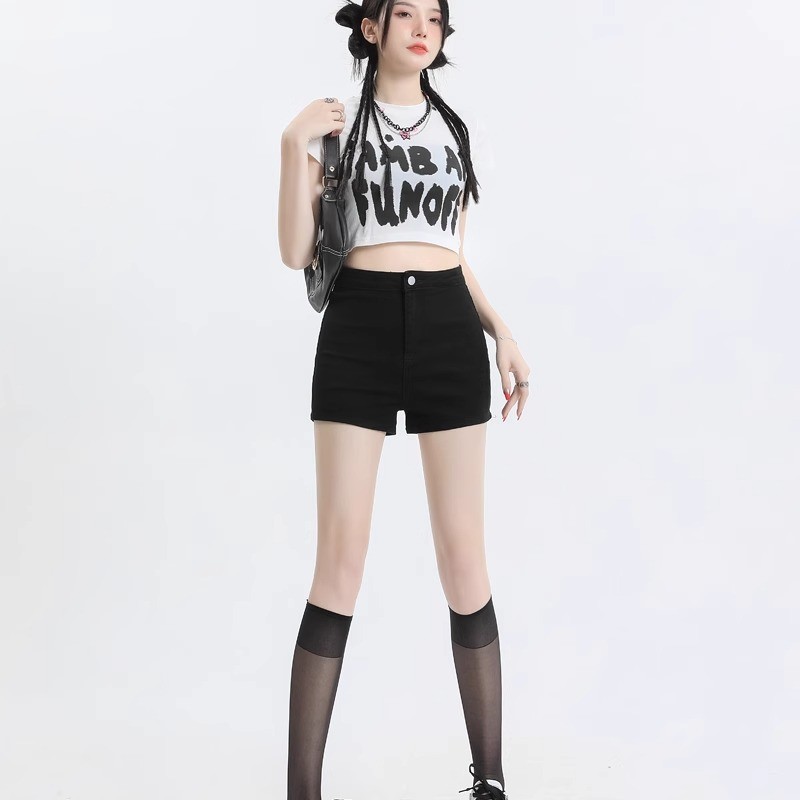 脚見せショートパンツ 黒ハイウエストストレートデニムショートパンツ女性ラップヒップホットパンツ