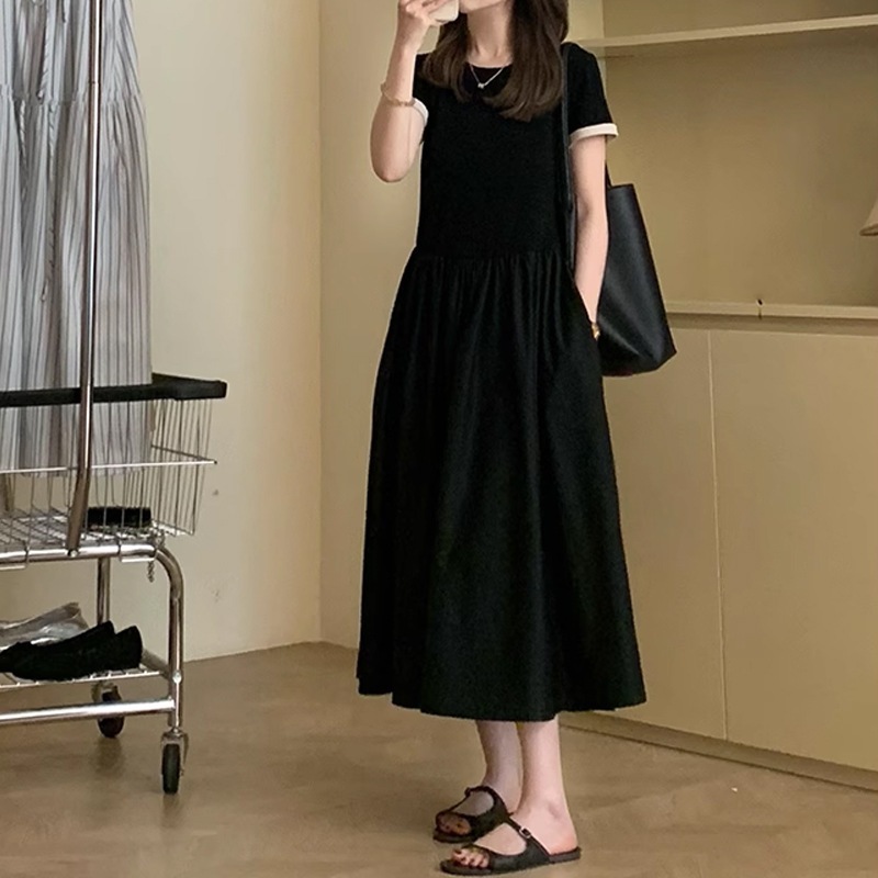 ワンピース ブラックロングショートスリーブワンピース25Aラインロングスカート