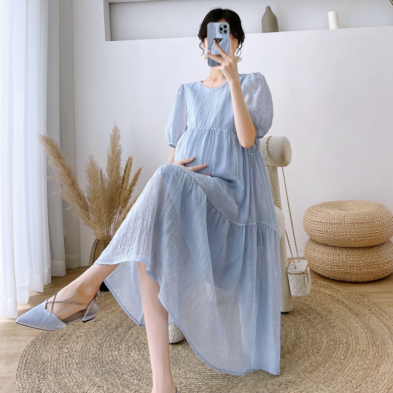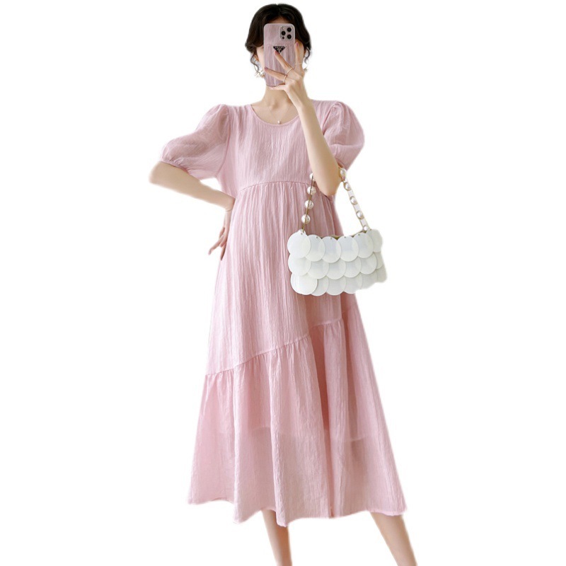マタニティウェア23韓国風大きいサイズシフォン無地つなぎゆったりミドル丈ラウンドネック半袖ワンピース
