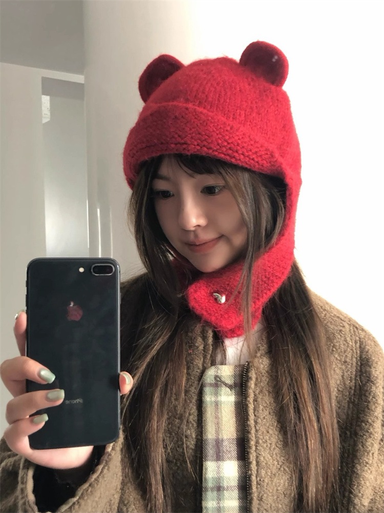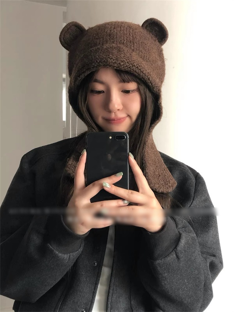 INSスタイル レディース くま柄ニット耳当て帽 ウール入り 暖かい 秋冬 風除け 帽子マフラー一体 6 色展開 可愛らしい雰囲気 着用心地よく 顔をすっきり見せられます