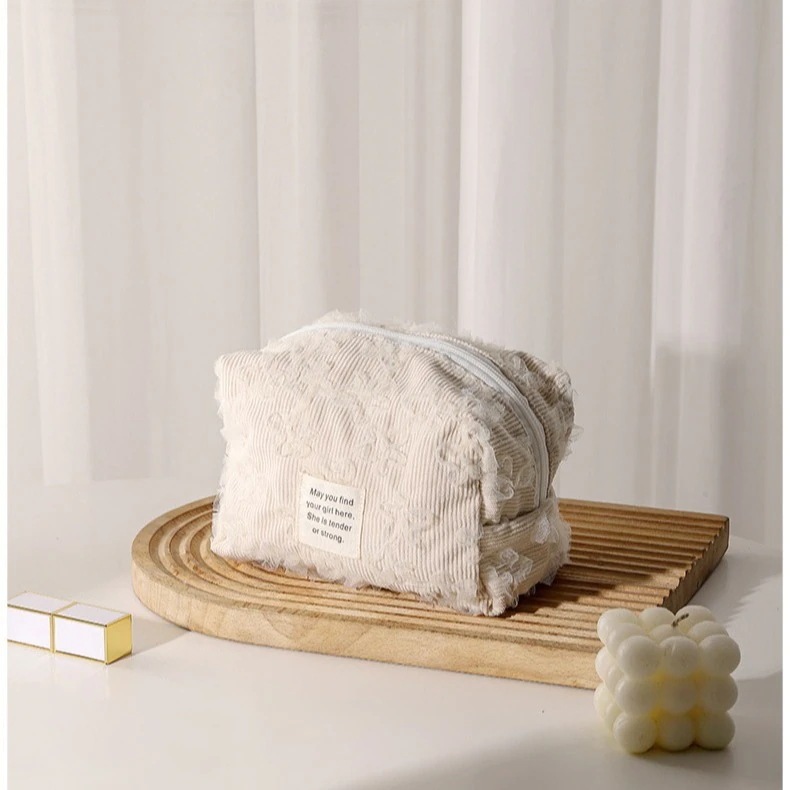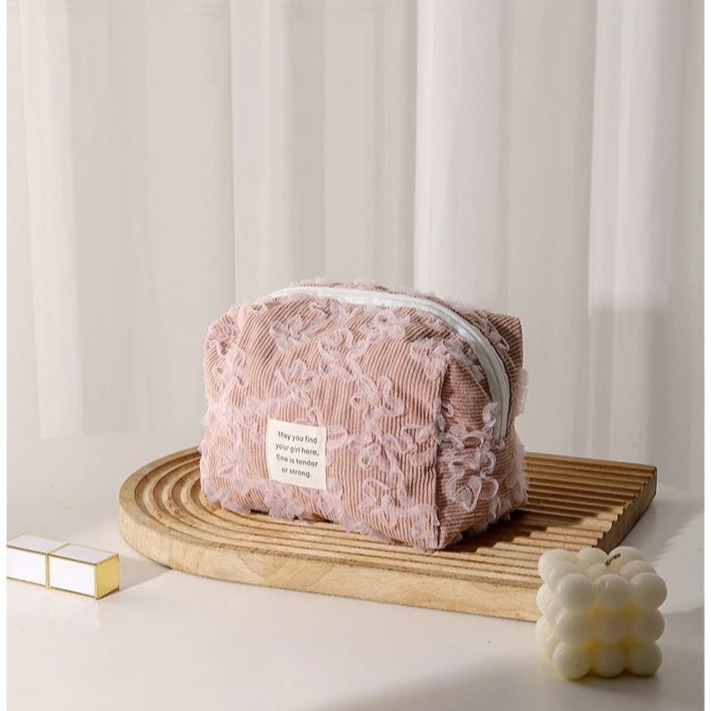 新入荷【3日出荷】立体 レース 刺繍 コーデュロイポータブル洗面バッグ 収納バッグ ポーチ 化粧ポーチ防水