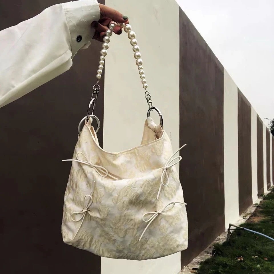 ミニバッグ レトロジャカードトートバッグ2025春と夏の新しいファッションパール弓ハンドヘルドシングルショルダー斜めクロスバッグ女性