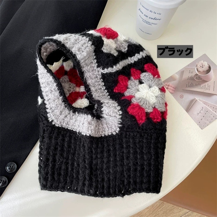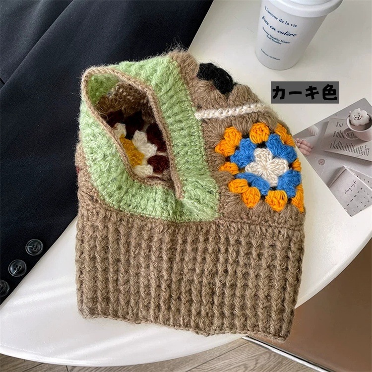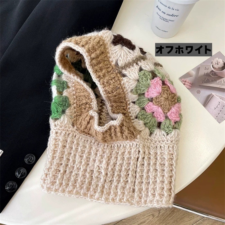 早い者勝ち かぎ針で丁寧に編んだ冬用ニット帽 首周りも暖かく包み込むデザインで トップから首元までしっかり防寒 3色の優しいカラー展開
