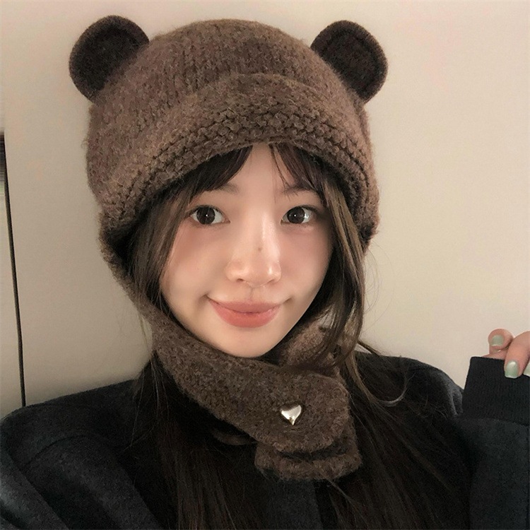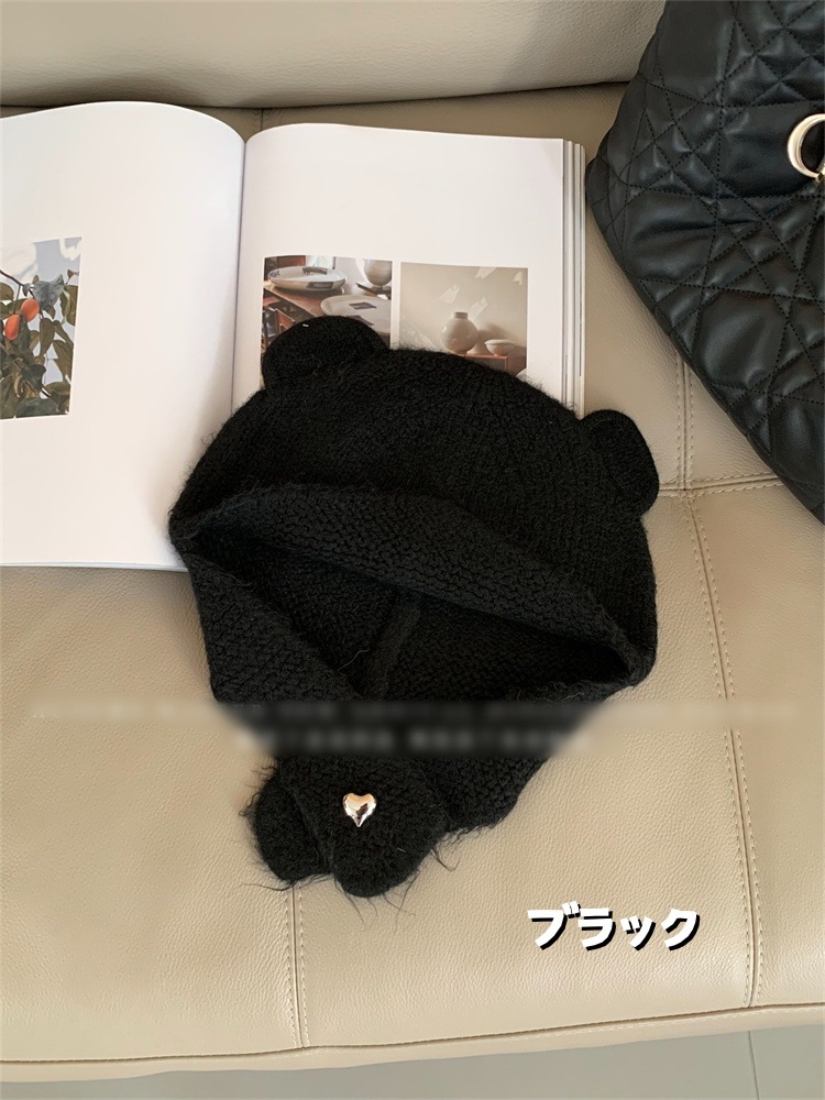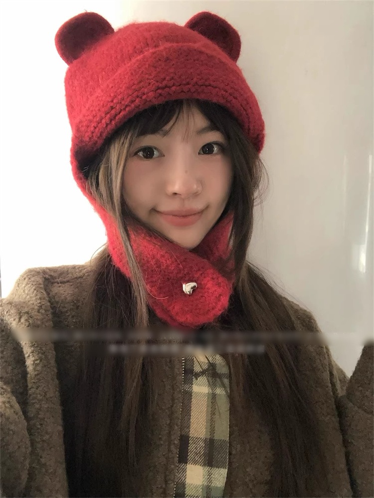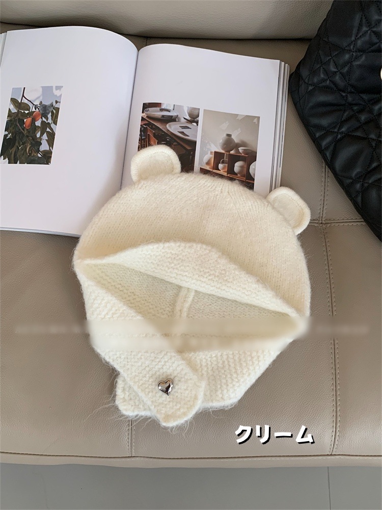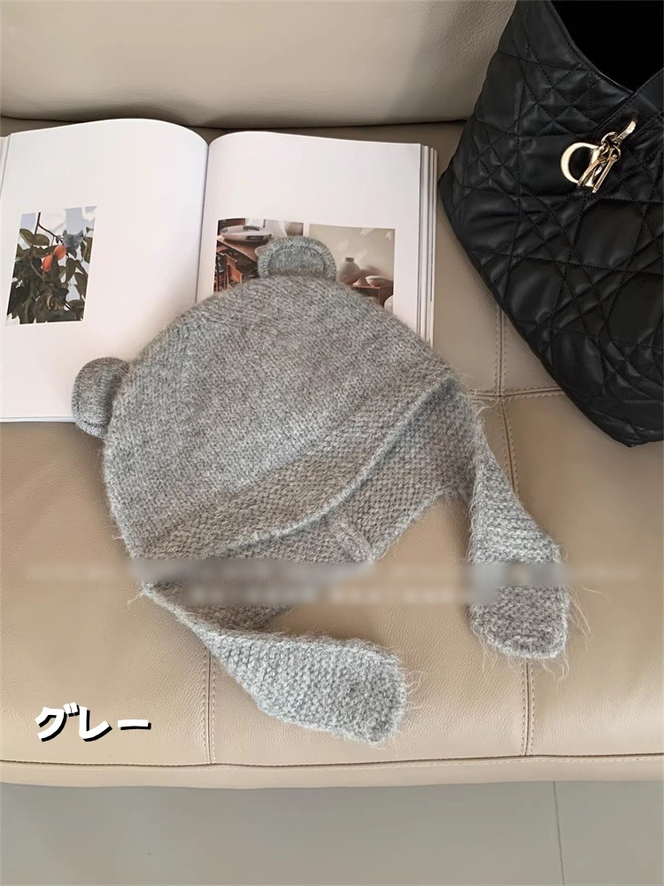 通勤する ウール配合 くま柄レディース耳当てニット帽 秋冬 暖か 風除け 帽子マフラー一体 6 色展開 可愛らしい 普段の外出に着用 顔をすっきり見せる