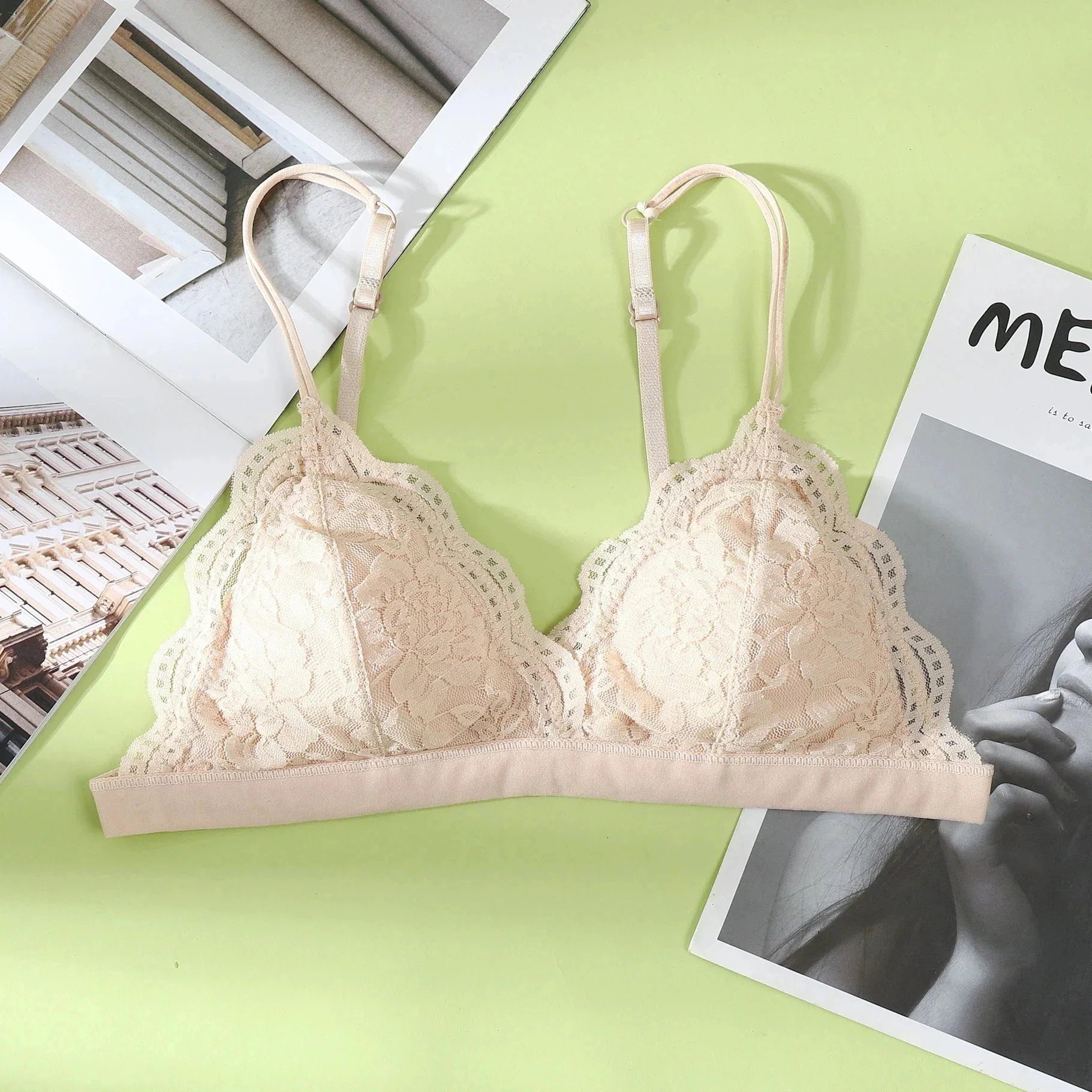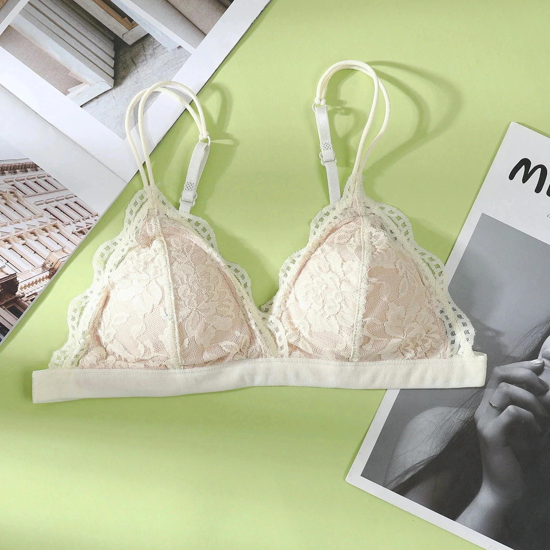 人気ブラジャー フレンチブラノンスチールリングセクシーレースナイトブラ夏の薄手ブラ大胸見せミニ三角カップ下着