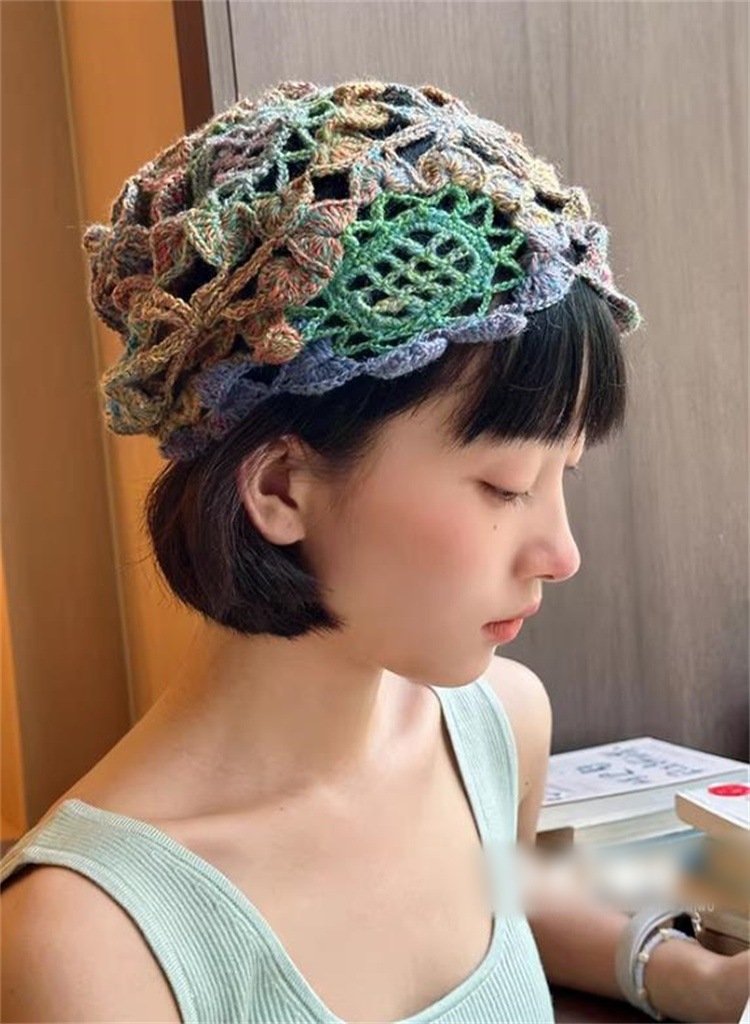 INSスタイル 2026春夏新作 レインボー包み帽 女性向け手作りフック花模様ニット帽 文芸雰囲気豊か 日常兼旅行撮影小物 カラー清新 ディテール精致 頭型にフィット 軽量通気