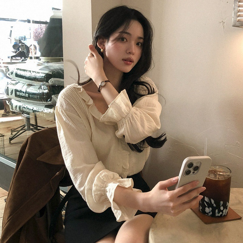 【3日出荷】シャツ チーク ブラウス ロマンチック ピコットフリル ラッパースリーブ フレンチ 春服 レディース 長袖tシャツ レディース 母の日