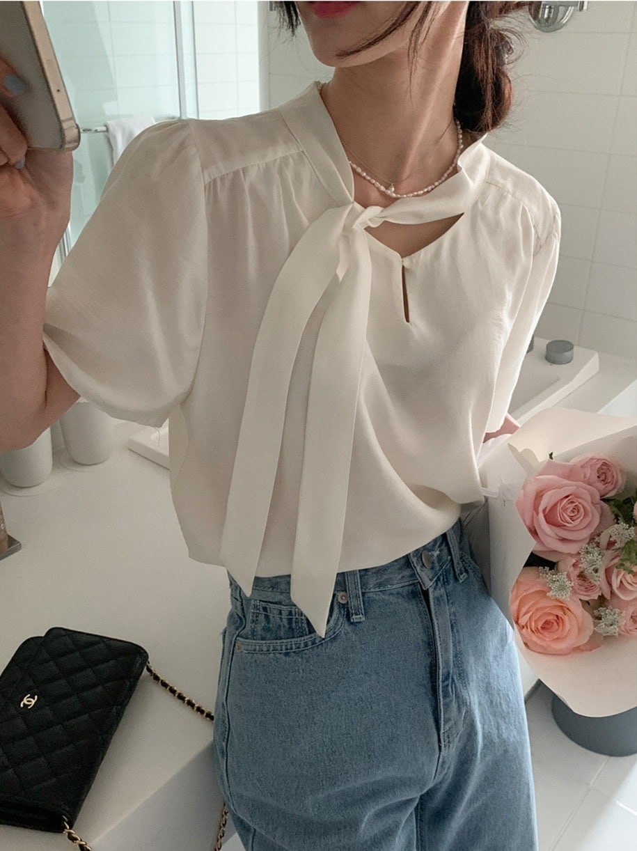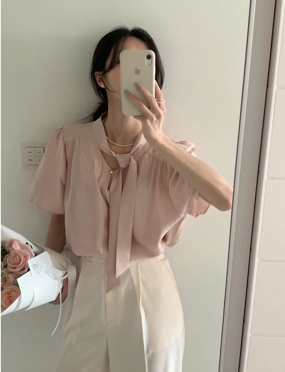 【3日出荷】シャツ チーク ブラウス フレンチ タイカラー 両面穿き パフスリーブ シフォン 春服 レディース 長袖tシャツ レディース 母の日