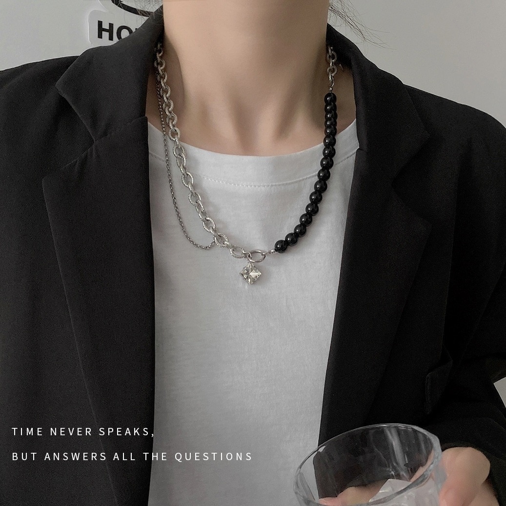 冷淡風CZジリコンブラック復古ボール太いチェーン切り替えネックレス鎖骨チェーンYN6528015101化粧ポーチ-大容量