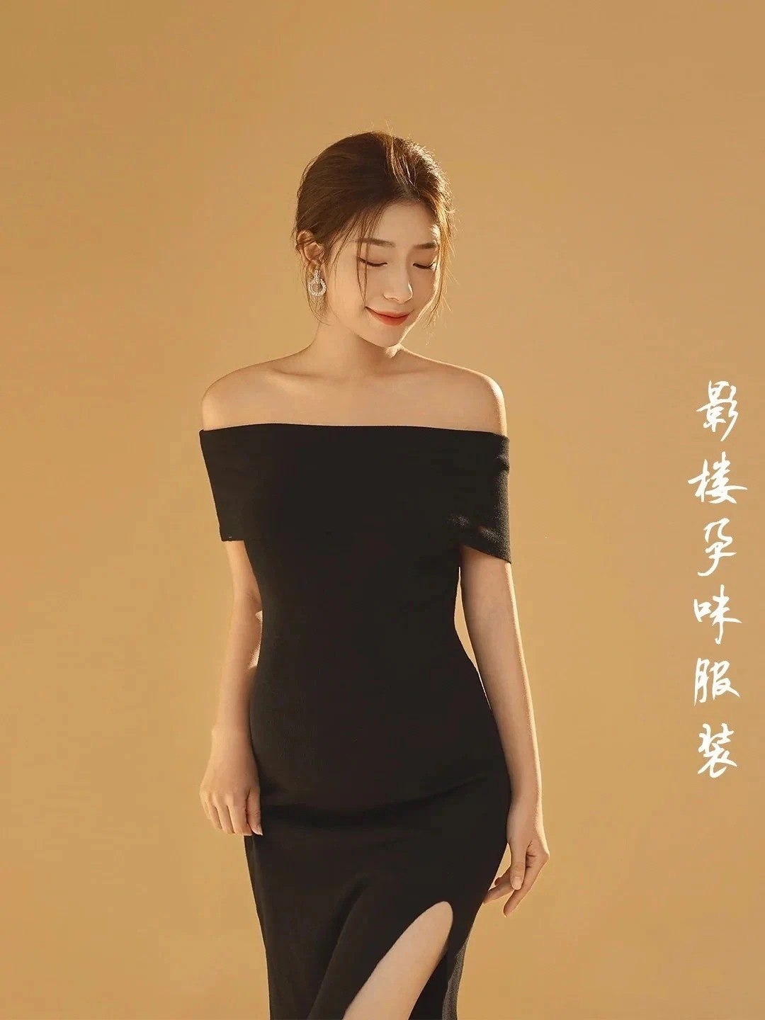 入荷 スタジオマタニティフォト服ブラックニットスーパースリムショルダーアートフォトスタジオ写真撮影スプリットドレス1化粧ポーチ-大容量