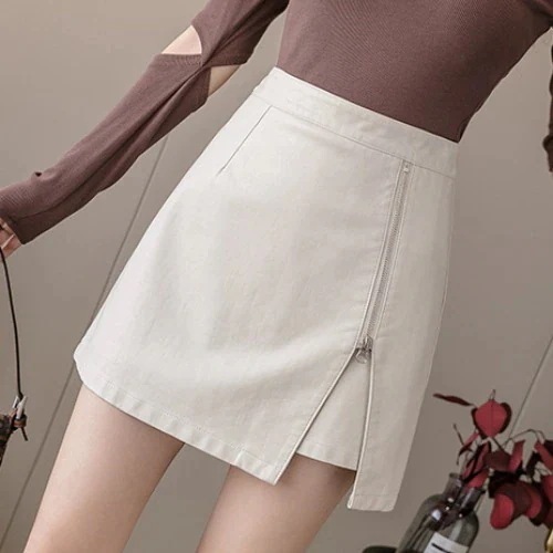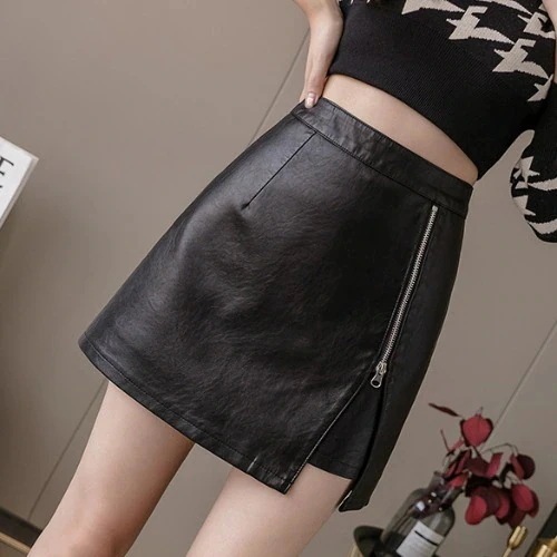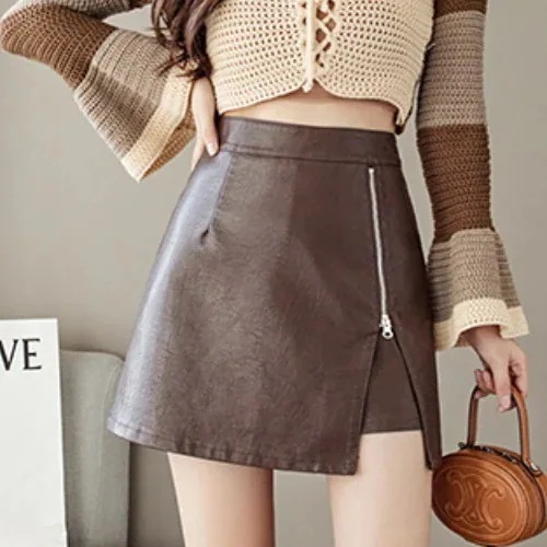 デザイン性のニッチなスリット入りアシンメトリースカート 2025年秋冬新作 ハイウエスト 細身効果 PUレザーミニスカート