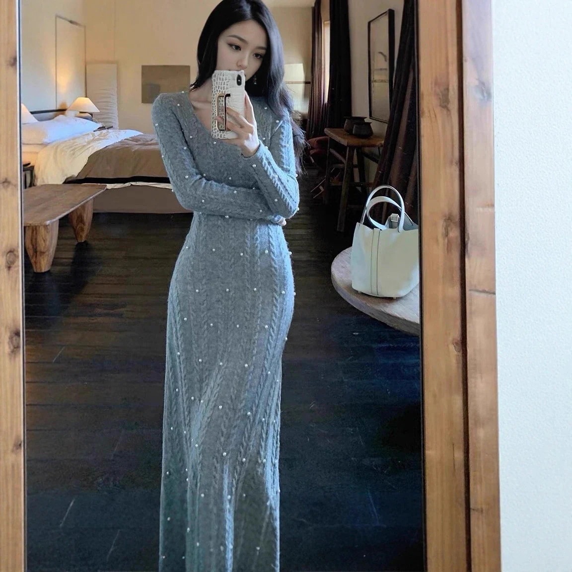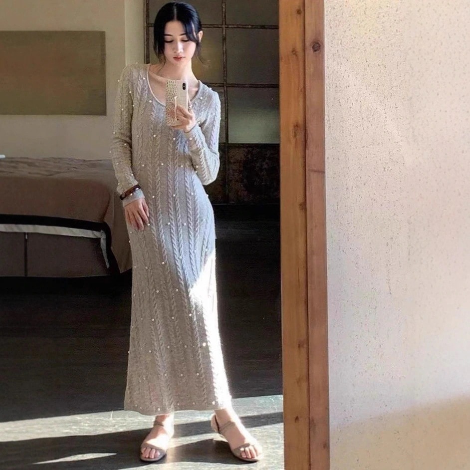 おしゃれで若々しいビーズ刺繍ニットワンピース 秋冬新作 スリムシルエット 気品あるツイストウエスト レイヤードロングスカート セーター レディースロング丈・長袖