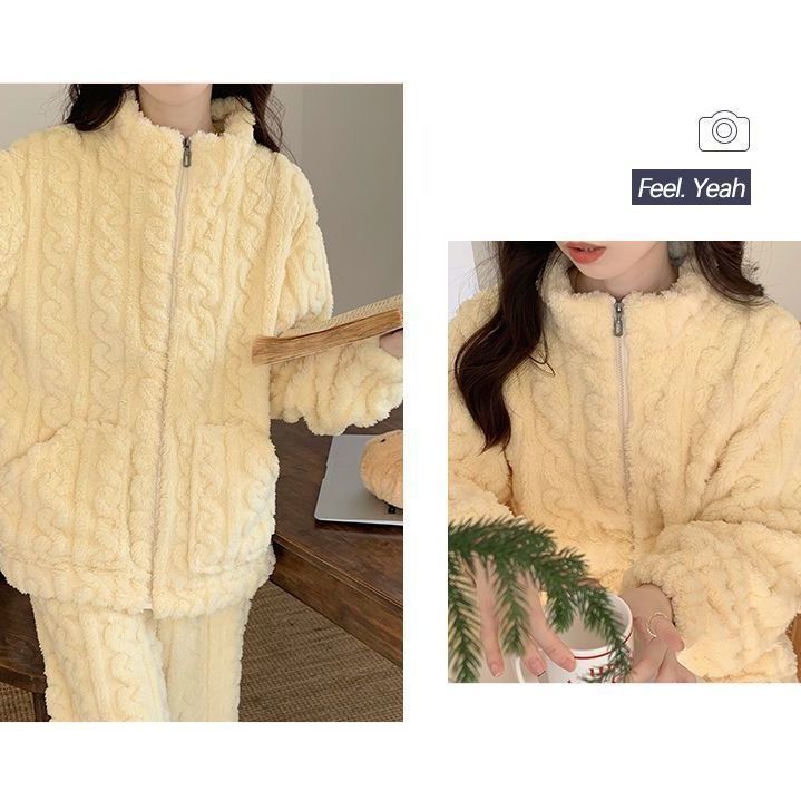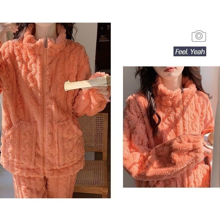 コーラルフリースパジャマ女性用ジッパー付き保温ホームウェア厚手キュートで可愛いシンプル長袖長ズボン