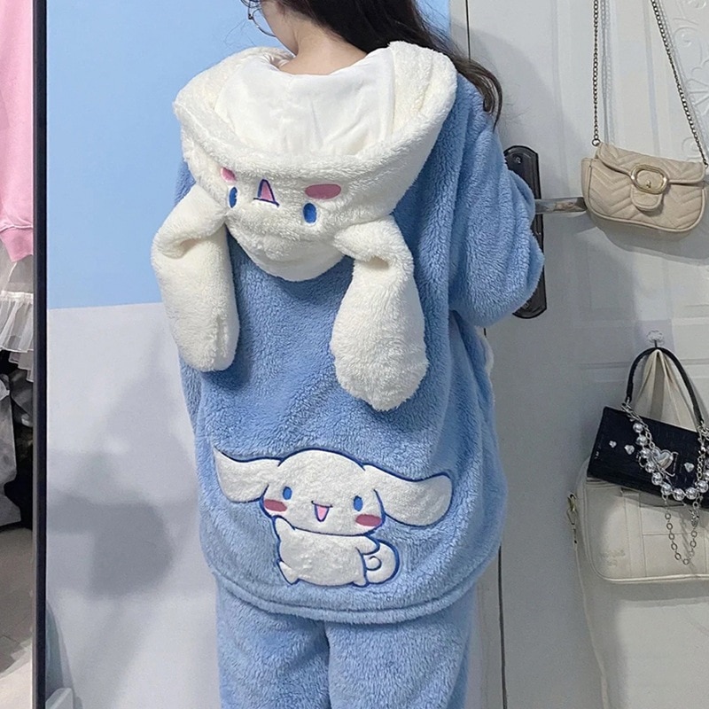 大好評!新しい和風シナモン犬パジャマ女性用冬学生アウタープラスベルベットコーラルベルベットフード付きホーム服セット