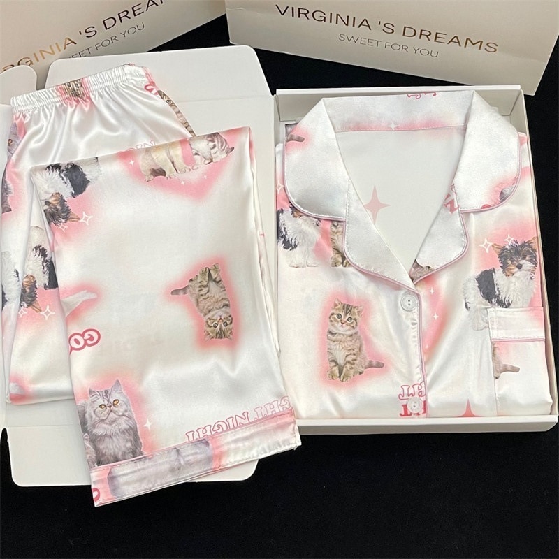 今だけパジャマ着【3日送信】かわいい猫のプリントの夏用薄手パジャマ女性が屋外で着用できるシルクホーム服スーツリアルショット