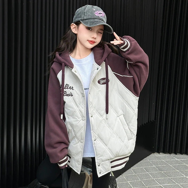 最低価格挑戦女の子用綿入りコート2026秋冬新作 子供用厚手野球ジャケット 冬用フード付き綿コート