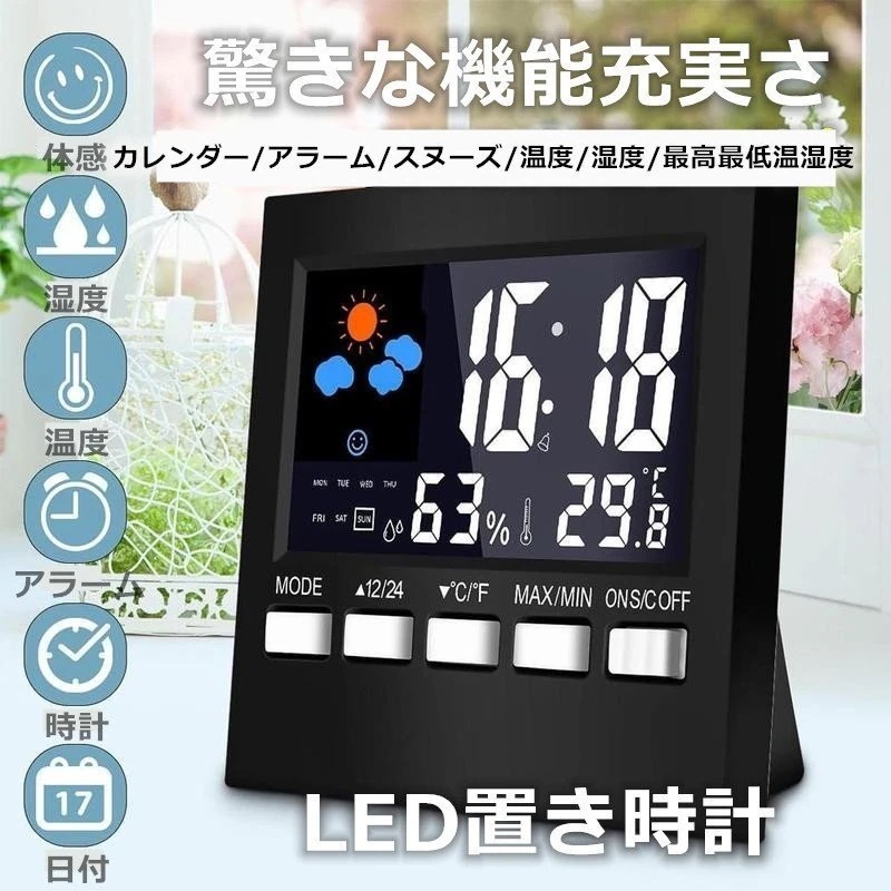 大特価【热销产品超级亮点】デジタル温湿度計 置き時計 目覚まし時計 時計 温度湿度計付き 体感表示 晴れ曇り 大画面 多機能