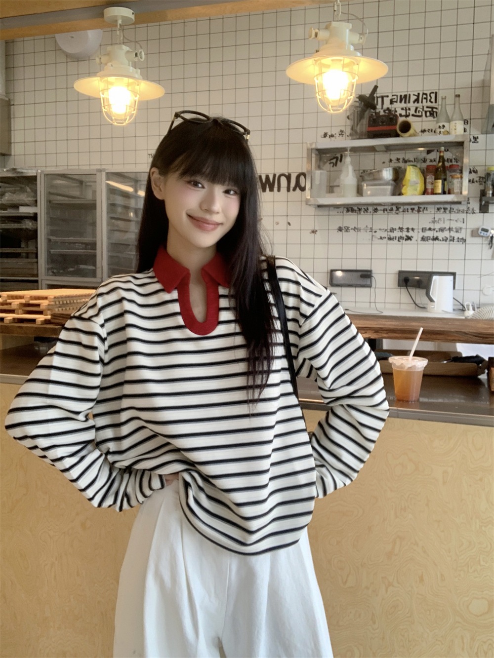 配色襟付きボーダートップス ゆったりシルエット カジュアル 春秋コーデ 大人可愛い 長袖 ポロシャツ ストライプ プルオーバー 長袖Tシャツ レディース アメカジコーデ 海外コーデ オシャレ女子 C3
