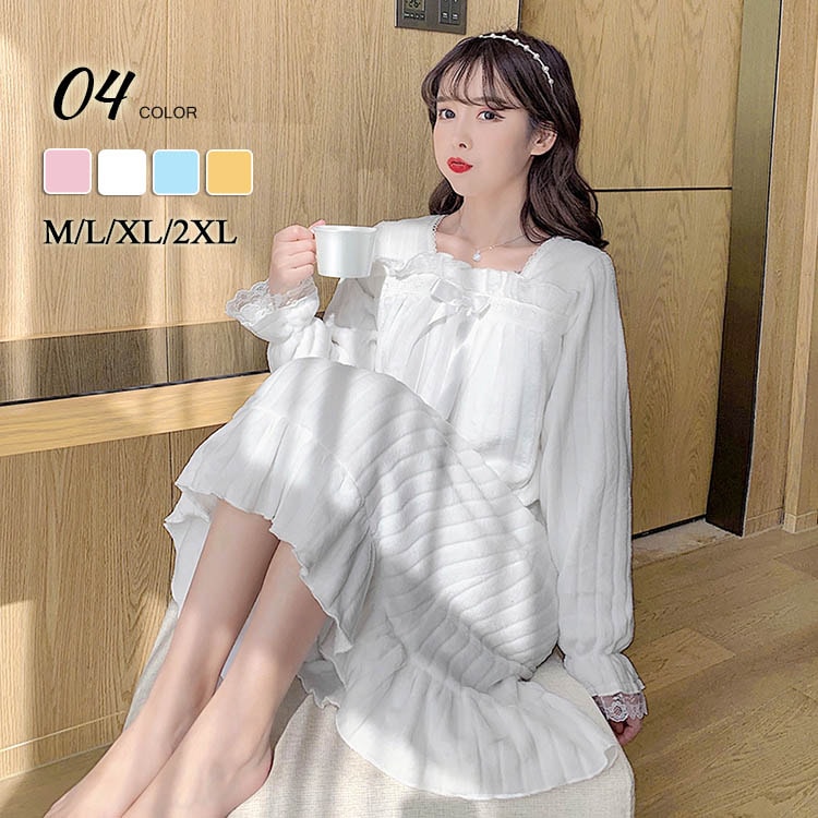 ネグリジェ パジャマ ワンピース リボン 長袖 マキシワンピース ロング丈 ウェア 部屋着