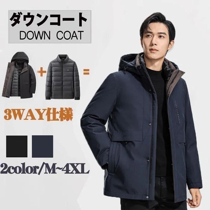 ダウンジャケット メンズ インナーダウン 3WAY ダウンジャケット フード付き 脱着式ライナー ネイビー ブラック 防寒着
