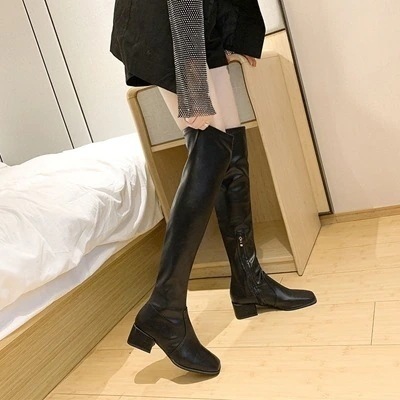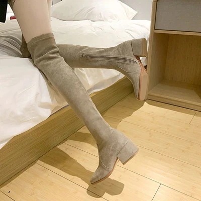 ニーハイブーツウィメンズチャンキーヒール5cmブラックベージュスエードフェイクレザーブーツ