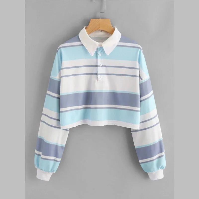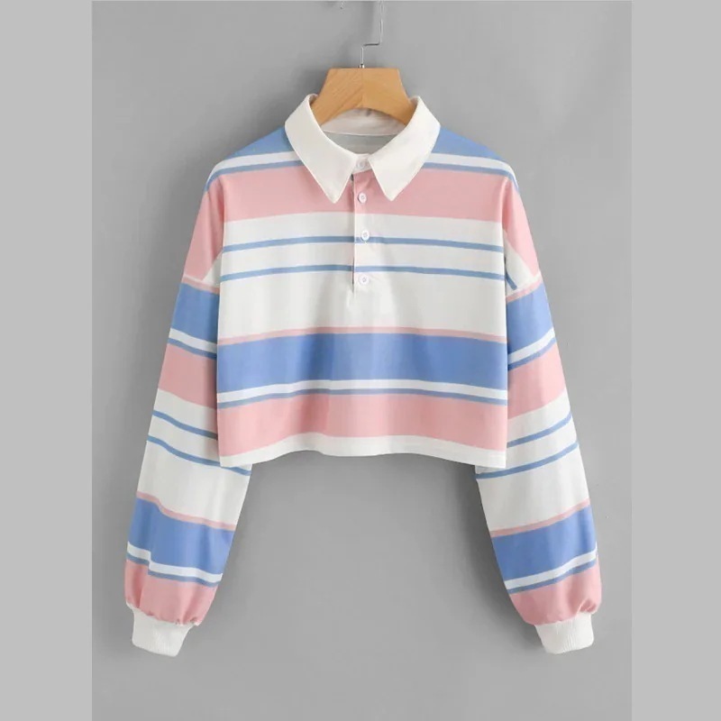 レインボーストライプ ポロカラー 長袖 Tシャツ レディース カジュアル クロップドトップ レディース 母の日wudamne