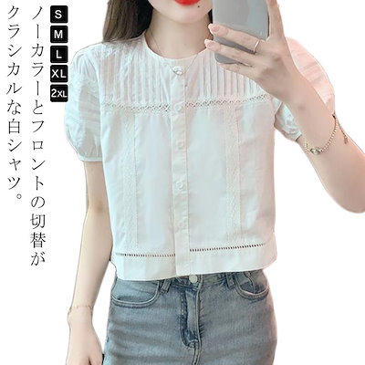 ブラウス トップス レディース ノーカラーブラウス レース 半袖ブラウス ショート丈 シャツ 可愛い フォーマル 春 夏 白 森ガール