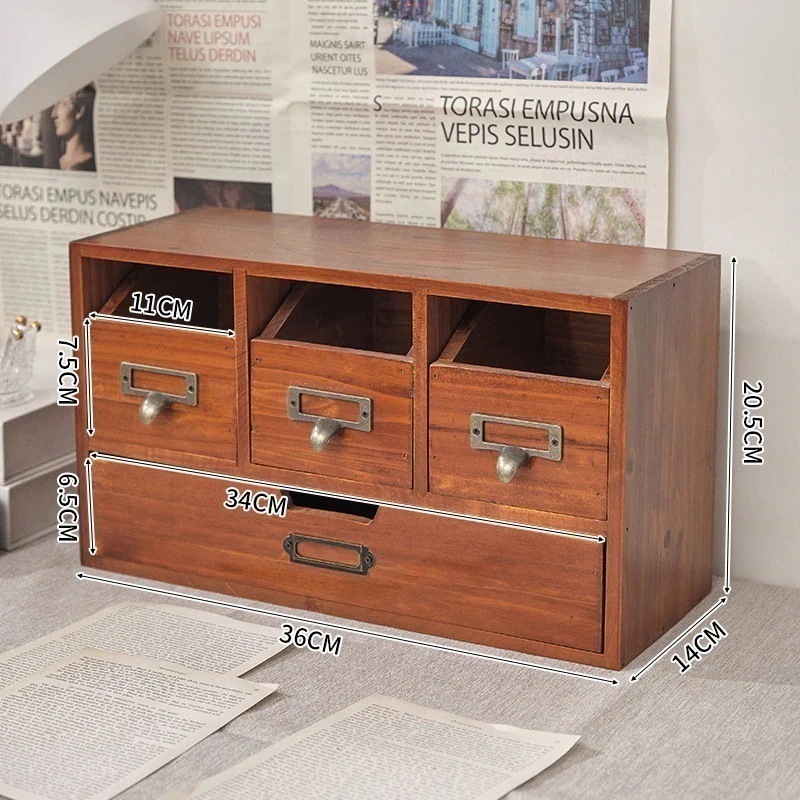 3つのコンパートメント1つの引き出しレトロな収納ボックス木製のデスクトップシェルフ雑貨文房具収納ボックス机引き出し収納キャビネット2306