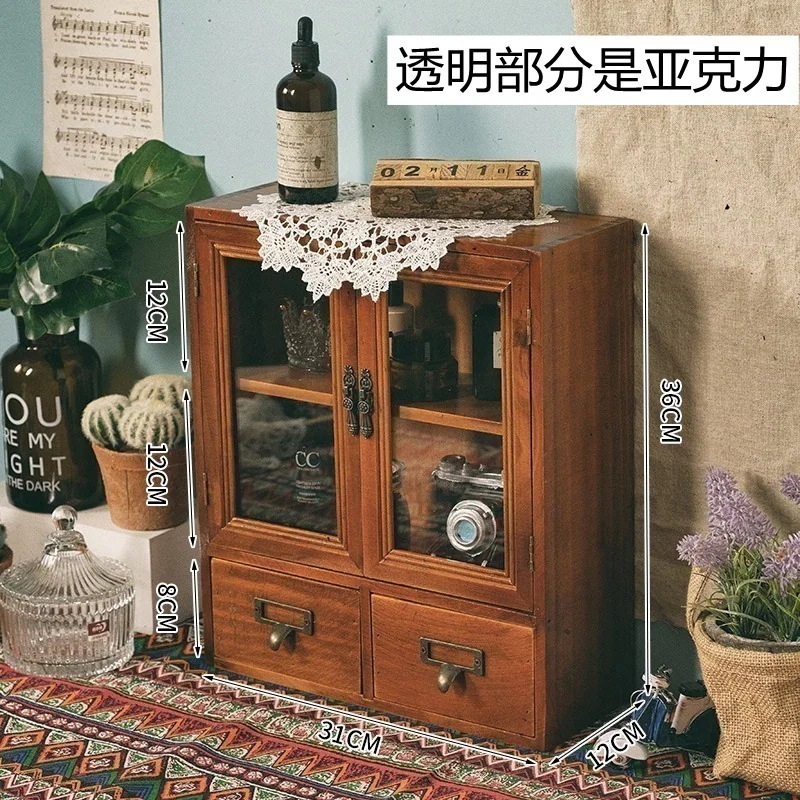 の無垢材ヴィンテージウッド両開きドアの陳列ケース雑貨化粧品収納キャビネット引き出し卓上収納ボックス23261110
